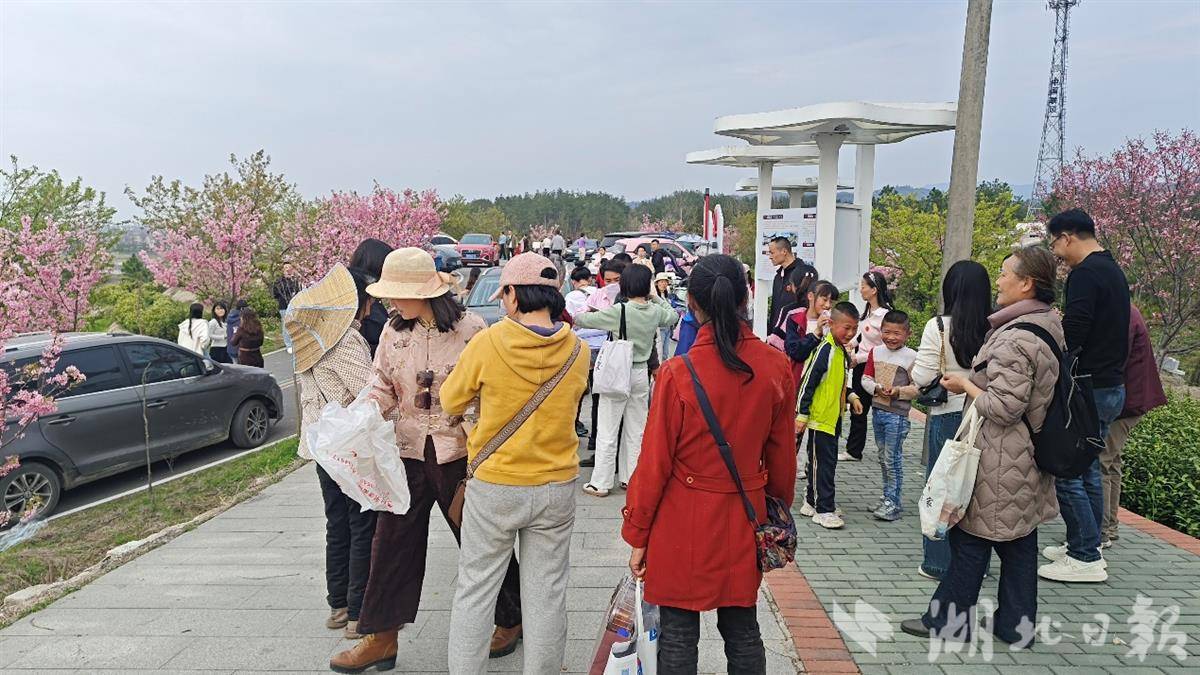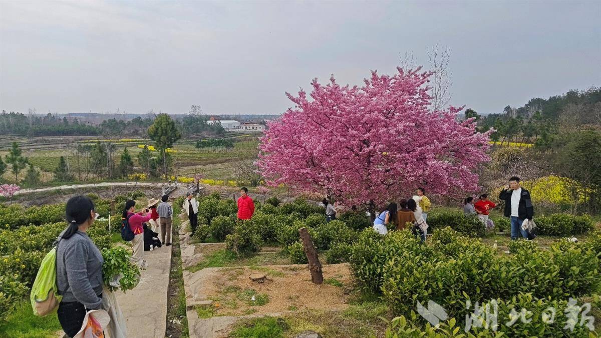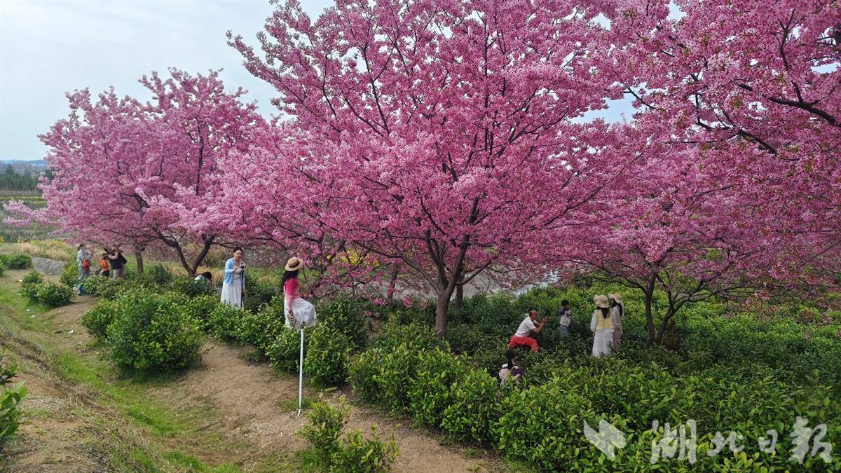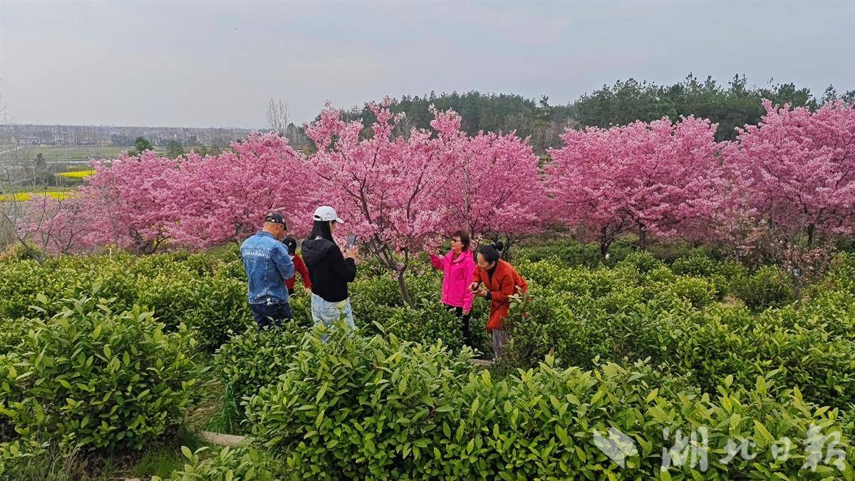 湖北日报讯(通讯员陶火应)3月14日,武汉市新洲区旧街石咀村的一片山岗上,几百亩茶树园内套种的400多株樱花进入盛花期。置身绚丽多彩的樱花,美得令人陶醉。