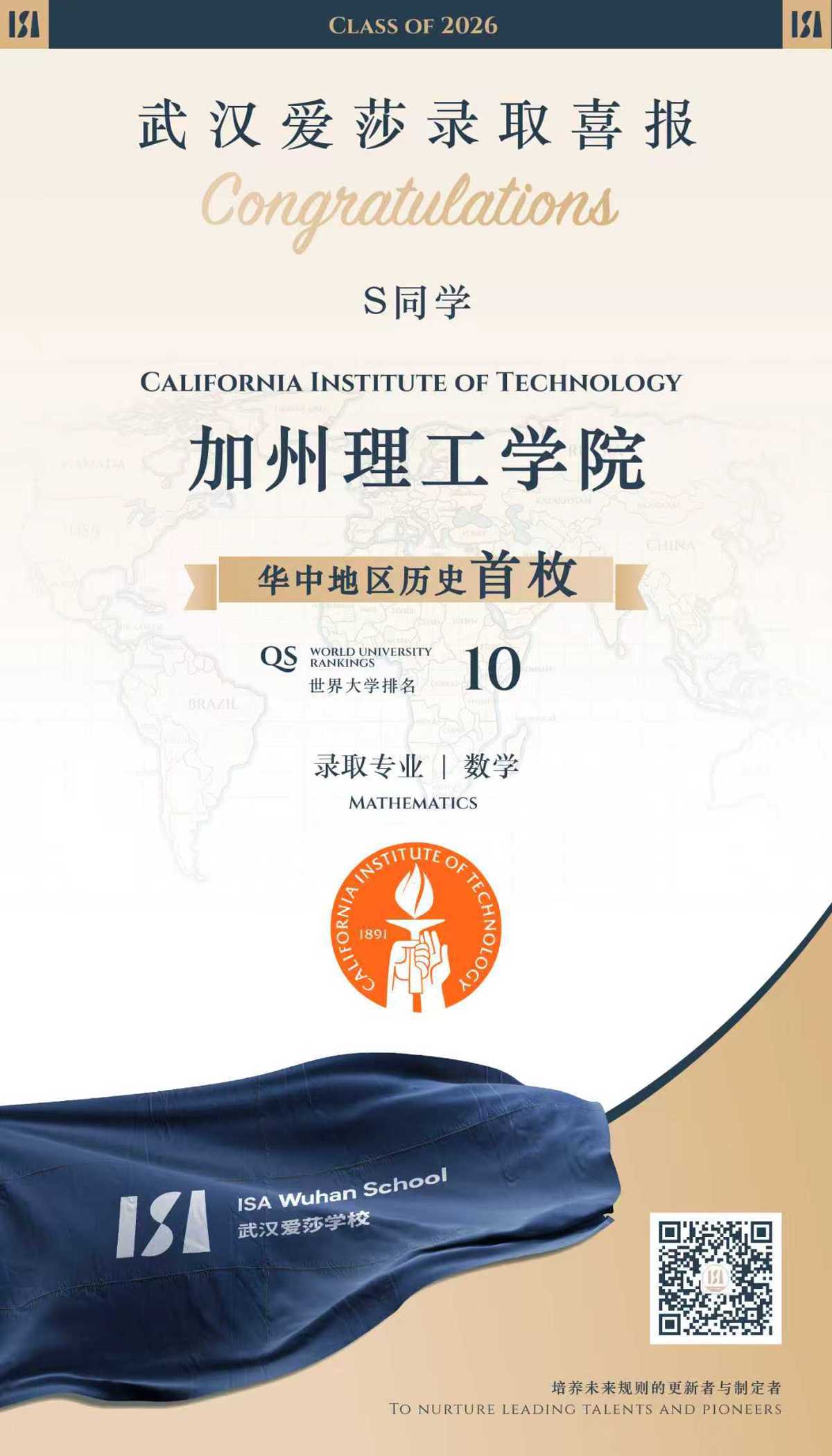 加州理工学院QS世界排名第10,堪称全球理工领域“圣殿”,百余年来孕育了74位诺贝尔奖得主,走出了钱学森等科学巨匠,选拔标准极为严苛。每年能叩开其大门的中国学子寥寥无几,2026年常规申请季,该校在中国大陆仅发出7枚offer。孙同学的突围,既是自身卓越的体现,更是武汉爱莎自主培养体系的必然成果。