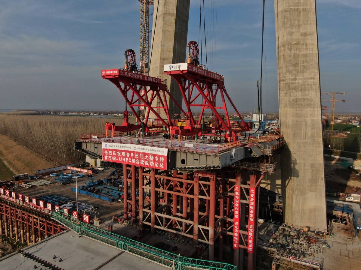 大桥江陵侧中跨共需吊装41个钢箱梁节段,此次吊装的首节段长13.25米、宽35.16米,重约605吨,为所有节段中最大重量。指着20多米高空的钢箱梁,中国铁建大桥局项目部总工程师王伟说:“钢箱梁的表面是UHPC材料,即超高性能混凝土,如果把大桥比喻成一个人,UHPC材料就犹如人体的最强筋骨。”