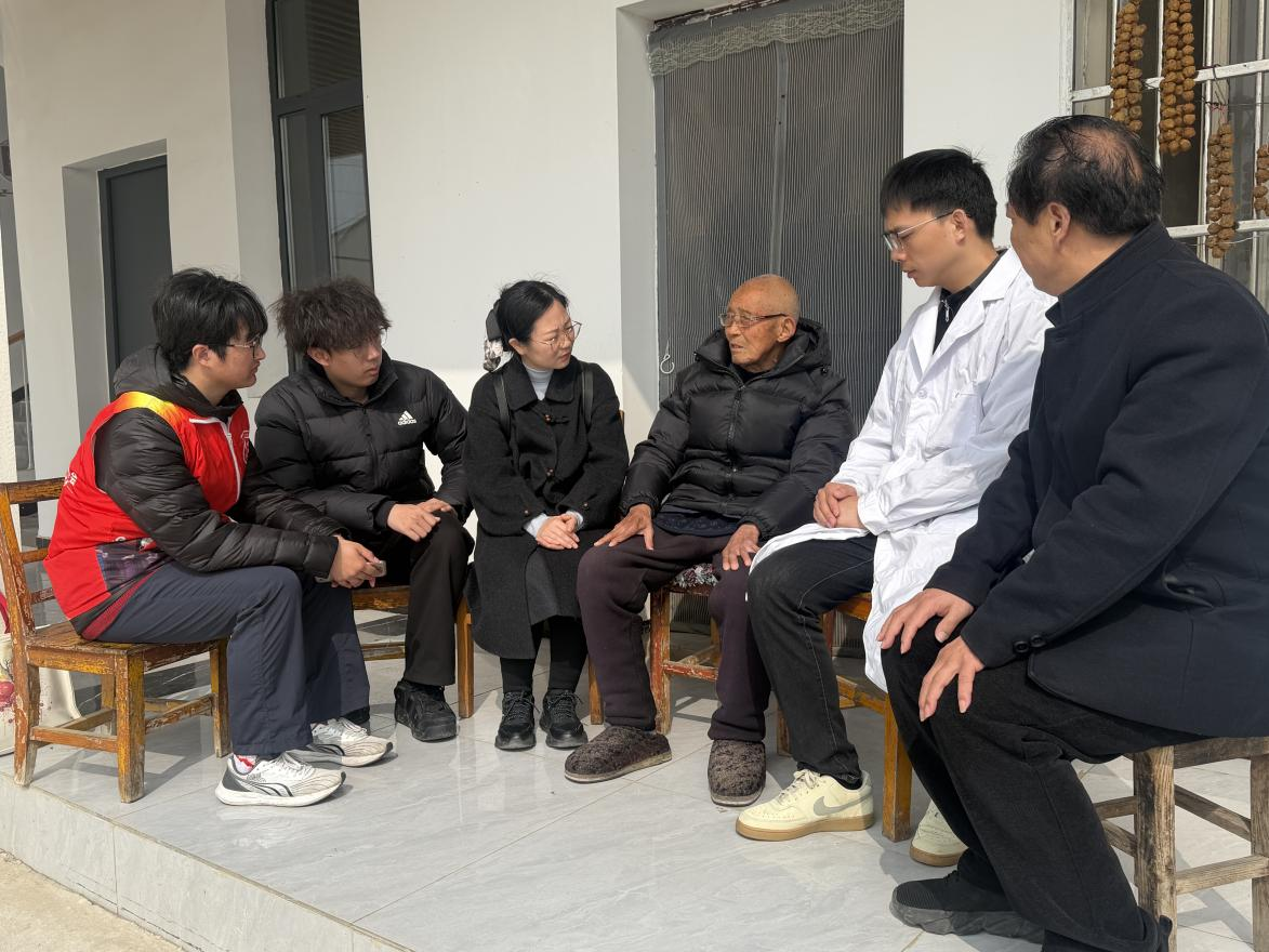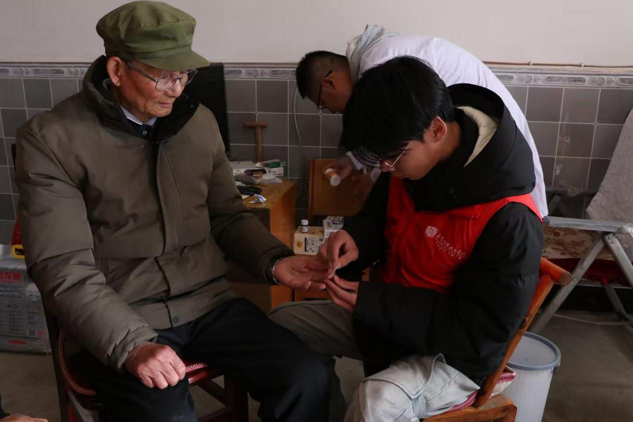 推开91岁抗美援朝老兵袁先仁的家门时,老人早已端坐在堂屋中等待。“爷爷,我们来看您了!”学生蹲下身,握住那双曾经握过钢枪的手,麻利地掏出血糖仪和血压计,一边操作,一边凑到老人耳边大声念叨:“爷爷,您血糖控制得不错,但降压药得按时吃!”