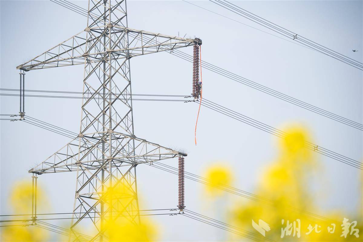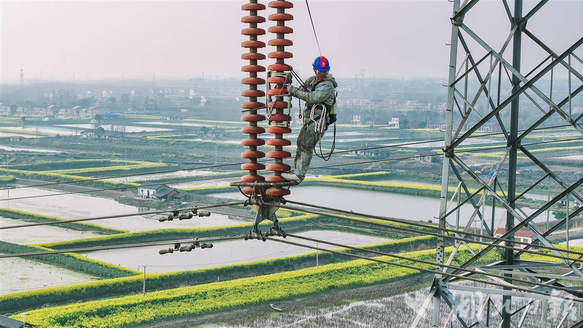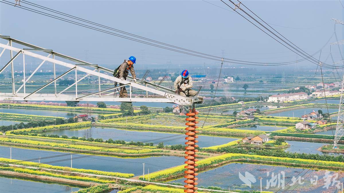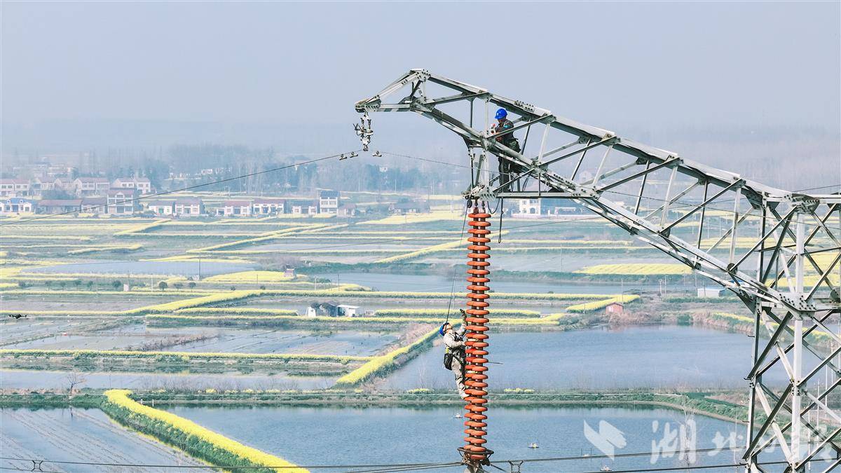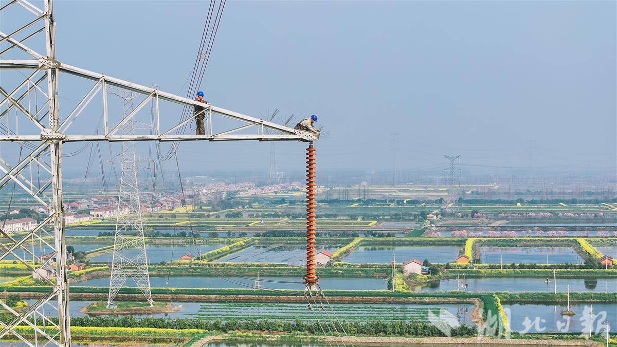 3月12日,在潜江市浩口镇,电力工人在500千伏江桃线168号铁塔上更换绝缘子,保障电力大动脉安全稳定运行。湖北经历了两轮雨雪冰冻天气,电力工人赶在春季时节,全面排查电力设备,保证夏季用电高峰安全稳定供电。(视界网 孔韬 欧阳雷 樊成浩 摄)