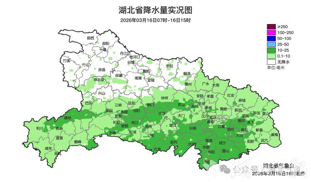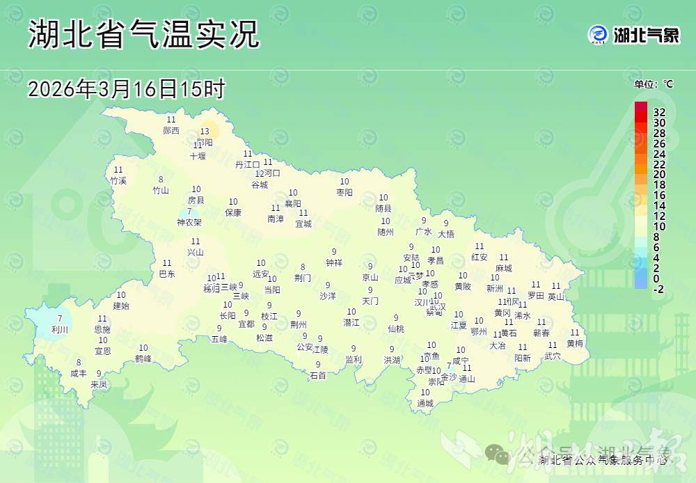 气象专家介绍,14日起,阴雨席卷我省,北风加大,气温下降。15日鄂西北地区出现小雨,其他地区小到中雨、部分乡镇大雨,十堰、襄阳南部、神农架和宜昌北部等高山区出现雨夹雪或雪,省内出现5到7级偏北阵风,大部地区最高气温7至13℃。16日早晨全省最低气温仅6至10℃,白天全省大部依然阴云密布。7至15时,除鄂西北出现零星小雨外,省内其他地区出现小到中雨,中西部气温略有上升,东部则继续小幅下降。17日阴雨天气持续,大部地区最高气温9至13℃。18至22日湖北以阴天间多云天气为主,南部地区有间断小雨,本周后期部分地区最高气温将再度突破20℃。