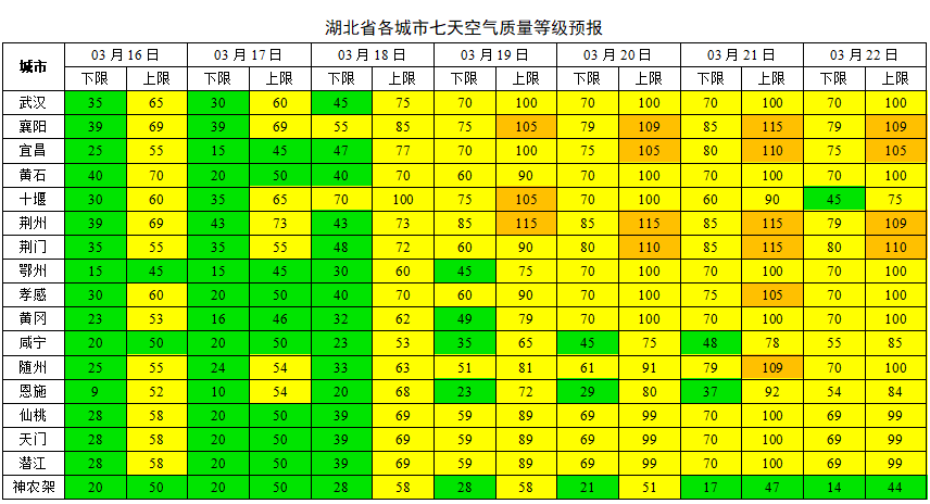 湖北日报讯(记者刘郸、通讯员李斌)3月16日,湖北省生态环境厅发布最新空气质量预测:预计本周(3月16—22日)前期空气质量较好,中后期有所转差。具体预报如下: