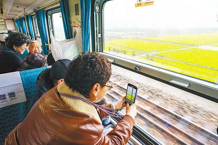 16日4806次列车乘客、来自福建的林女士和两位闺蜜相约武汉赏花,不巧刚到武汉就遇到下雨天。几人刚好刷到武汉铁路环线列车开通的消息,立马决定购票。上车后,一路上天兴洲的油菜花海、汉口的闹市、长江大桥、黄鹤楼等景点、景观,让她们拿着手机拍个不停。“以前小时候坐过这种绿皮车,现在再来坐感觉好亲切。如今的高铁虽然坐着很舒服,但难以像这样慢慢地欣赏沿途的美景,坐在这就像能和车外的景色交流一样。”