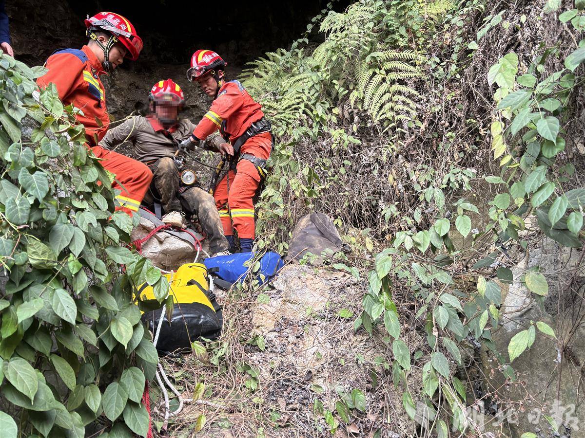 事发洞穴位于半山腰凹槽处,洞口狭窄,宽度仅约1米,垂直深度近百米。接警后,消防救援人员迅速赶到现场。经勘察发现,洞内通道纵横交错、地形复杂,岩壁陡峭湿滑,无攀爬着力点,救援难度极大。被困男子坠落至洞内约20米深处的平台,仅受轻微擦伤,意识清醒,但因惊吓过度无法自主移动。