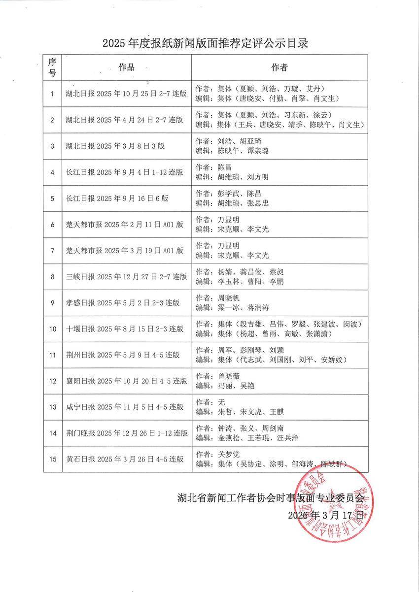 受湖北省新闻工作者协会委托,湖北省新闻工作者协会时事版面专业委员会组织专家学者及部分媒体负责人,对申报2025年度湖北优秀新闻作品(报纸新闻版面)进行初评,确定15件作品参加2025年度湖北优秀新闻作品定评。
