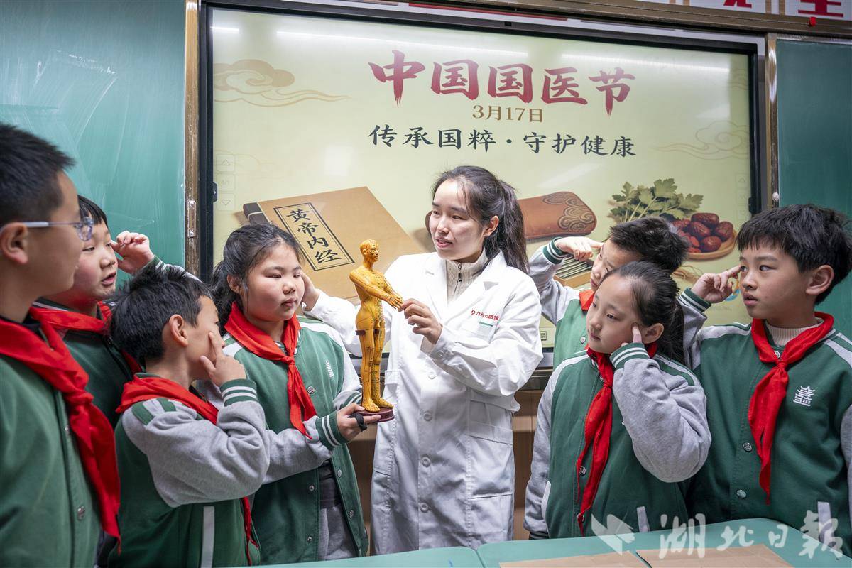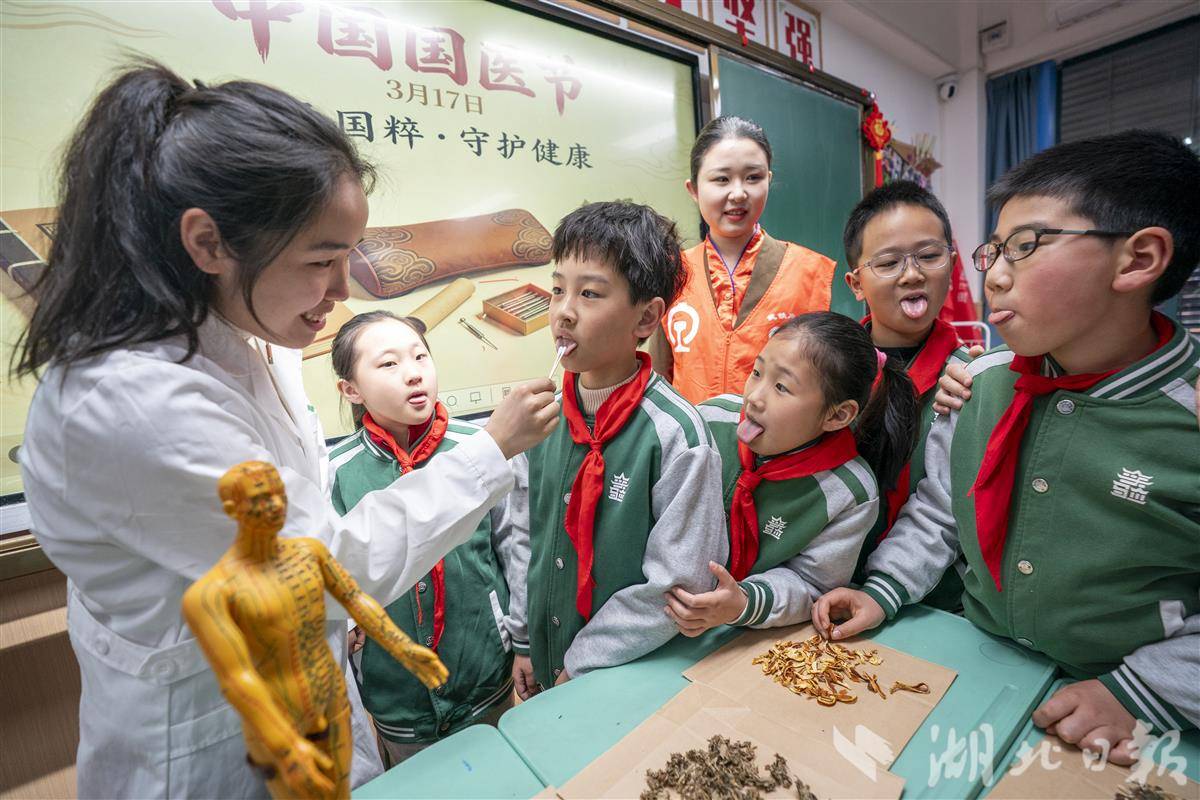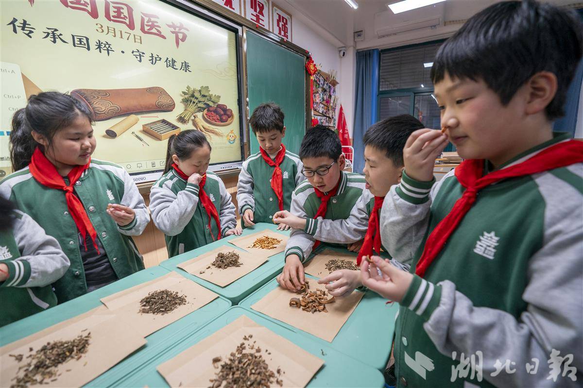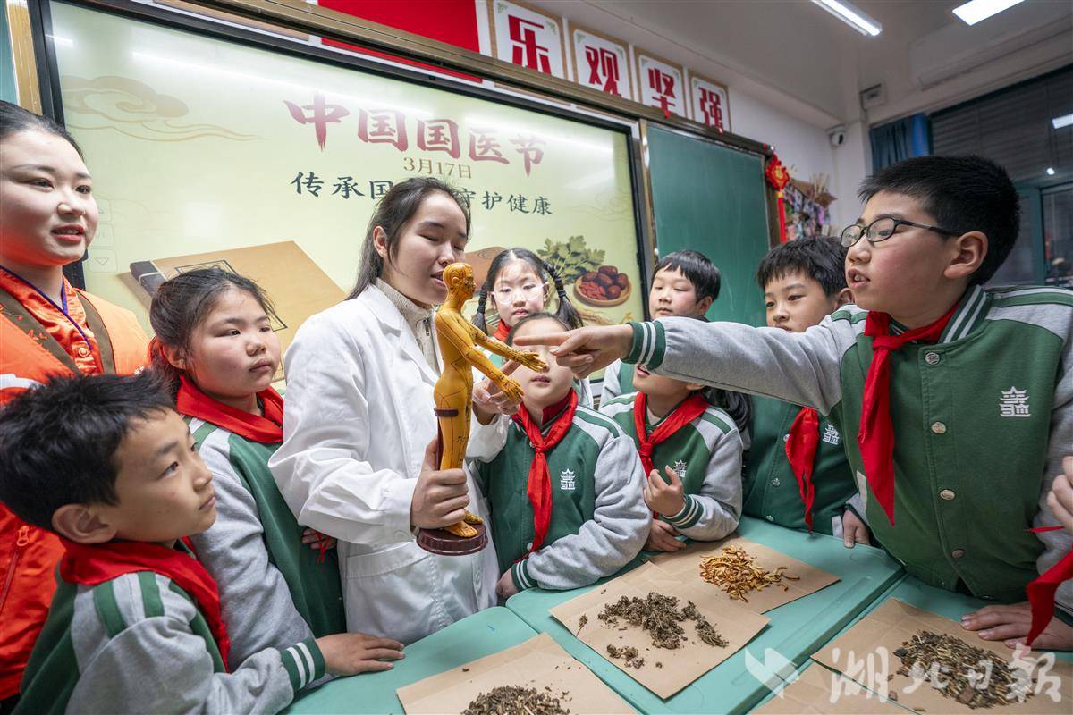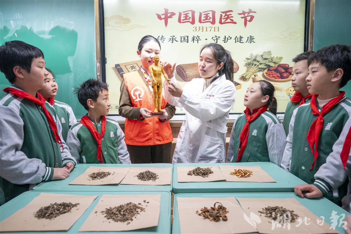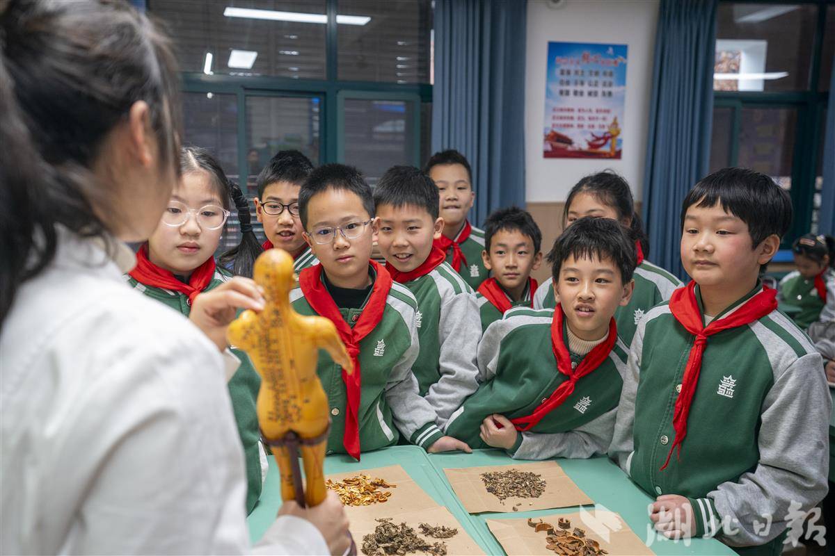 3月17日,武汉市洪山区未来实验外国语学校美林校区邀请中医医师与武汉客运段志愿者走进校园,开展中医药文化宣传活动。3月17日是中国国医节,“国医”就是我们熟知的中医,它被誉为中国的“国宝”,承载着数千年的深厚历史和辉煌成就。同学们通过了解中医药知识、学习穴位教具、认识常见中药材等形式,近距离接触中医药历史,感受中医药文化的魅力,令中医药文化“活起来”。(湖北日报全媒记者 魏铼 通讯员 雷迪 邹登勇 摄)