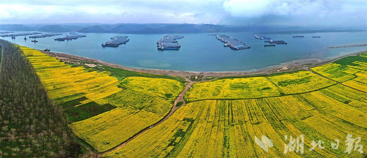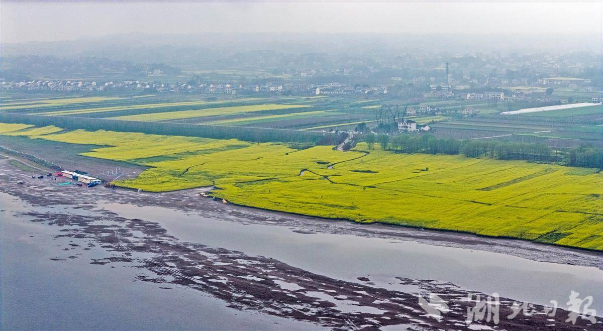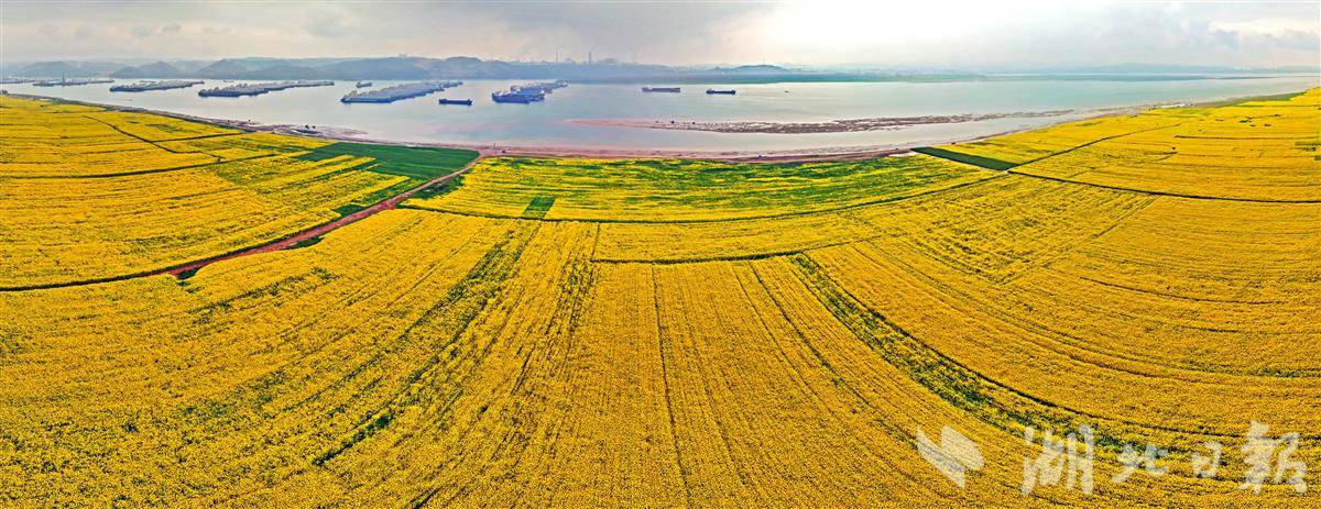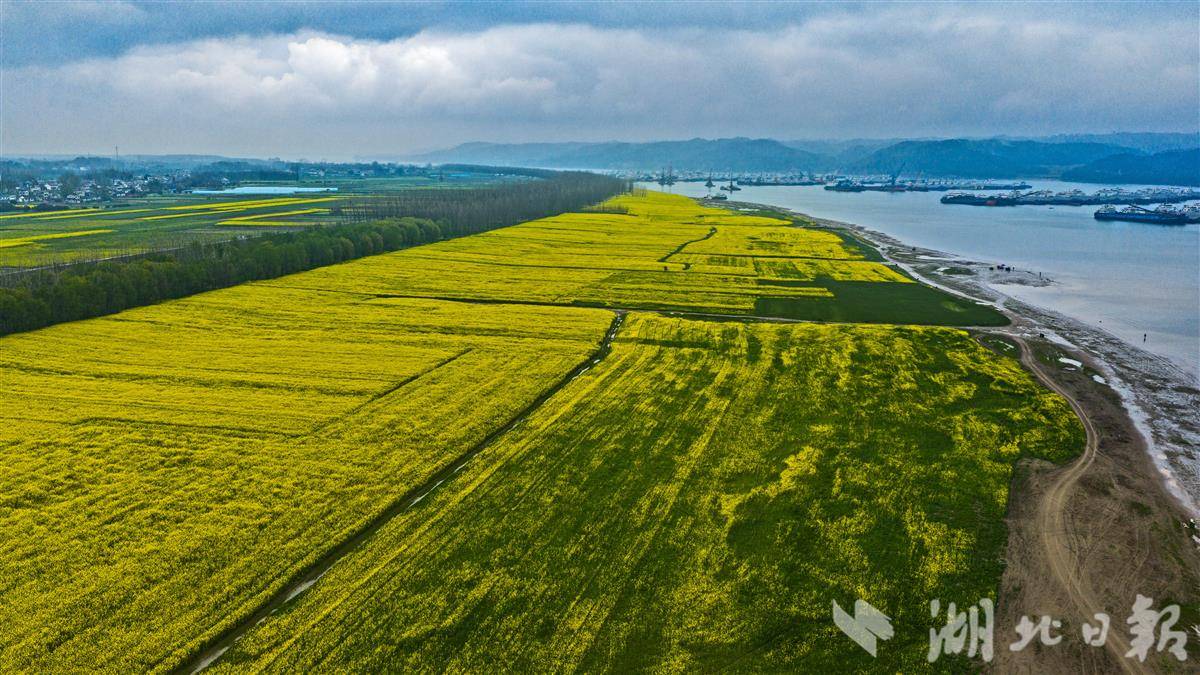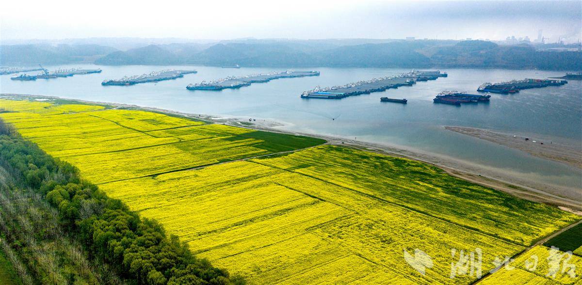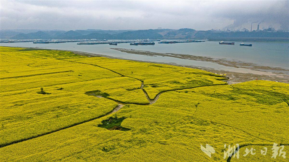 3月17日,枝江市顾家店镇千亩江滩上,连片油菜花进入盛花期,金黄花海沿长江岸线绵延铺展,与奔流江水相映,尽显长江金色岸线的壮阔之美,构成一幅独具韵味、气势磅礴的滨江春日图景。