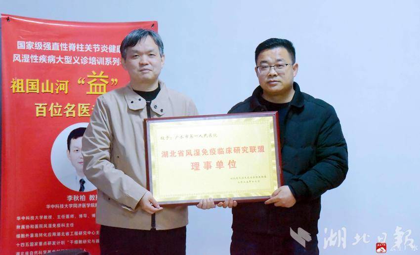 在学术分享环节,刘晓晶教授详细介绍了“强直性脊柱炎健康乡村项目”的整体规划、实施流程及核心目标,明确了项目在患者筛查、诊疗管理等方面的具体安排。李秋柏教授带来了强直性脊柱炎诊疗方面的最新研究进展及风湿科GCP项目介绍,分享了风湿免疫领域的前沿学术成果,并授予广水市一医院“湖北省风湿免疫临床研究联盟理事单位”,为提升基层风湿免疫诊疗水平注入新动力。