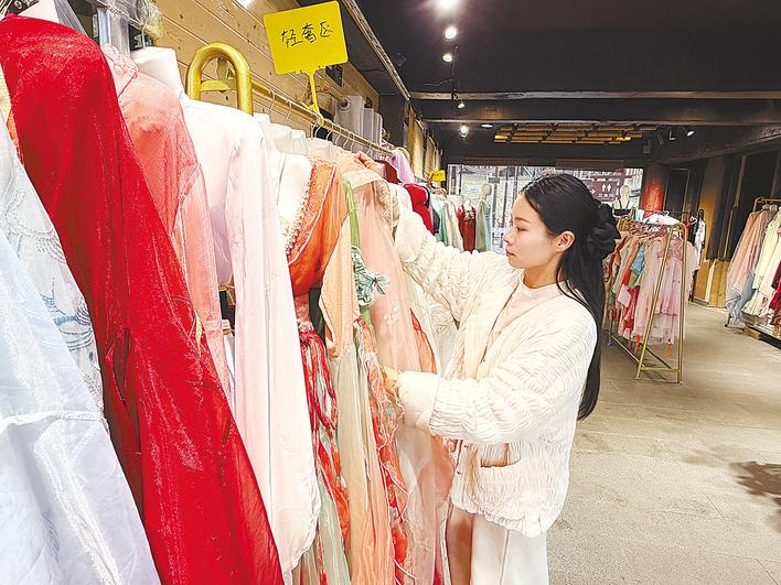 “天外飞仙”店主叶子正在整理服装。 (湖北日报全媒记者 杨文漪 摄)