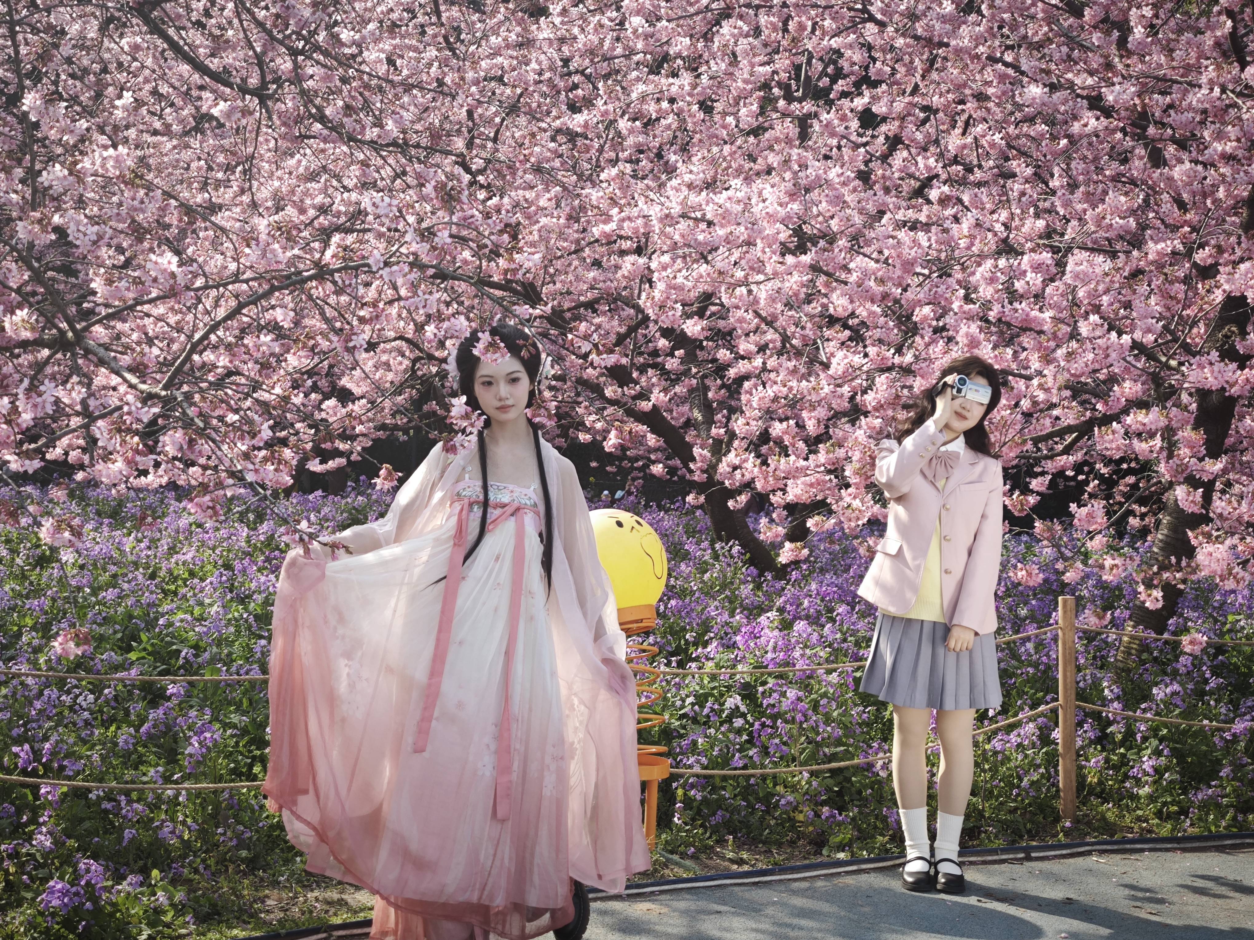 年前,大林还坐在浙江的广告棚里,对着精密的灯光和产品。那时他没想到,有一天自己会泡在樱花的海洋里,为天南地北的游客定格春天的模样。