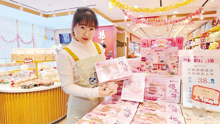 扬子江旗舰店店员推介樱花饼。 (湖北日报全媒记者 冯袁玥 摄)