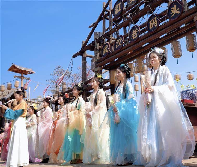 叶子做的“天外飞仙”,是传统汉服妆造结合吊威亚体验。游客穿上定制华服,由专业设备吊起,在湖面上空“飞行”,江夏里的古建筑、油菜花田、坡地梅花、桥上装点的樱花尽收眼底。