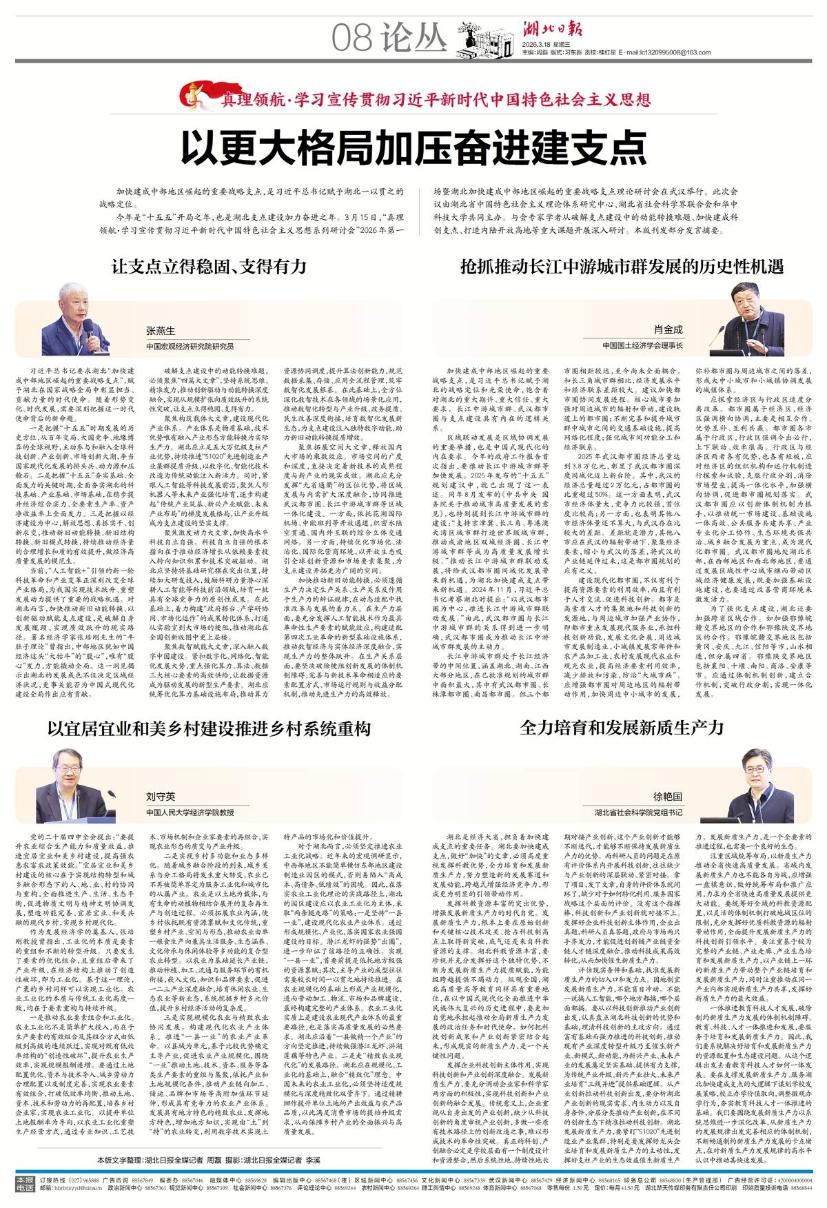 聚焦激发动力大文章,加快高水平科技自立自强。科技自立自强的根本指向在于推动经济增长从依赖要素投入转向知识积累和技术突破驱动。湖北应坚持将基础研究摆在突出位置,持续加大研发投入,鼓励科研力量潜心深耕人工智能等科技前沿领域,培育一批具有全球竞争力的原创性成果。在此基础上,着力构建“政府搭台、产学研协同、市场化运作”的成果转化体系,打通从实验室到大市场的梗阻,推动湖北在全国创新版图中更上层楼。