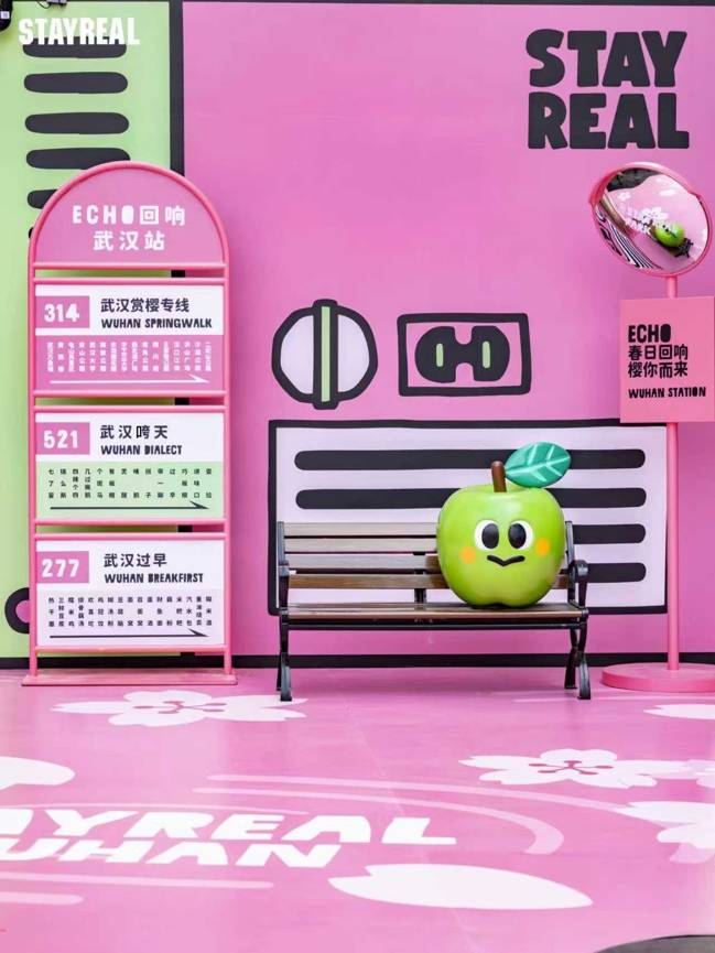 与野蛮的甜青苹果排排坐,倾听你的故事,感受别样春日美好氛围。STAYREAL PARK ECHO武汉站的站牌上,“赏樱专线”标记着从早樱到晚樱的浪漫;地道的武汉方言“咵天”让人会心一笑;而“277路”则巧妙借用了“爱吃吃”的谐音,传递出武汉人对过早的无限热爱。每一处细节,都是通往城市记忆的入口。