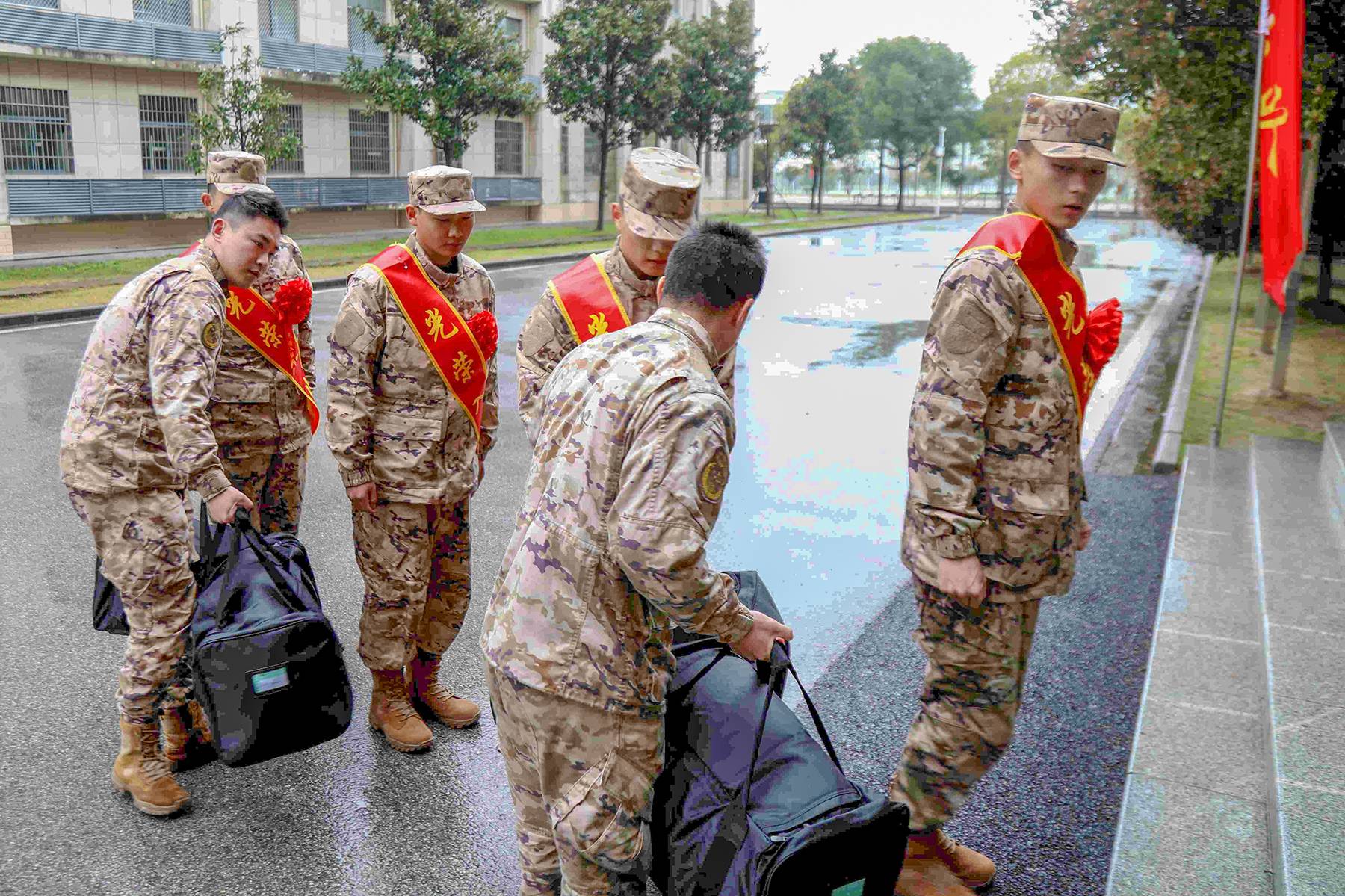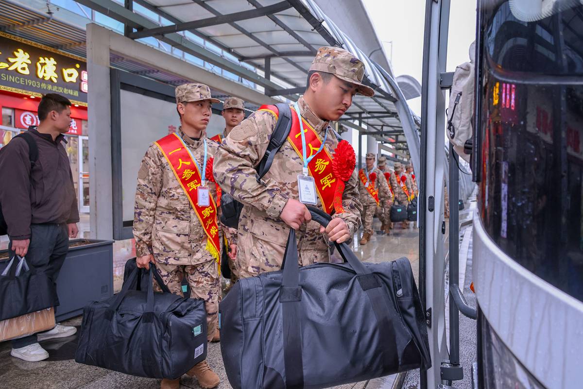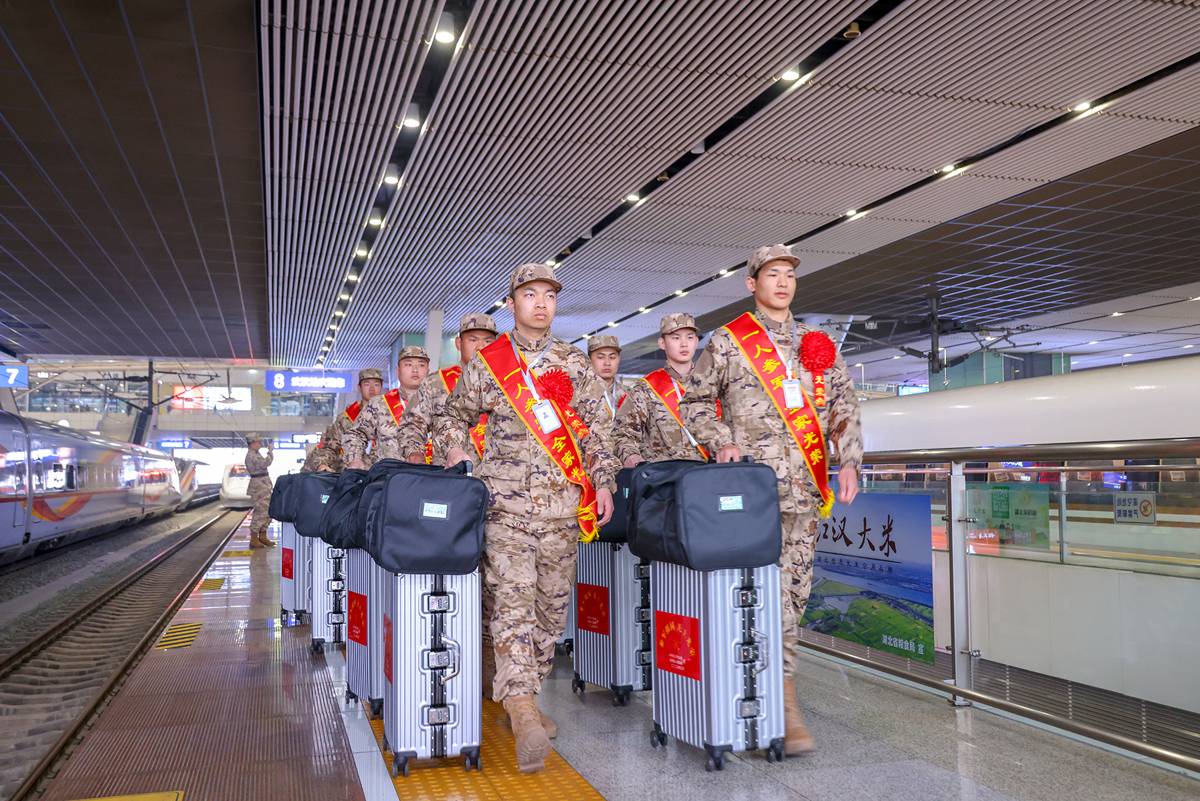 在武汉各火车站,接站官兵军容严整、精神抖擞,早已等候多时。负责接站的班长迅速上前接过他们手中沉甸甸的行李,引导新战友有序登车。