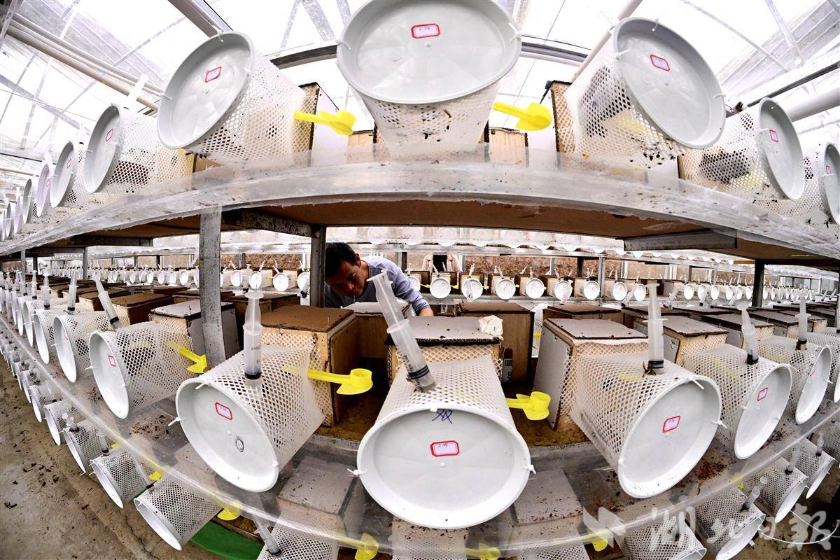 3月15日,十堰市郧阳区柳陂镇高岭村的郧阳胡蜂培育基地温室大棚里,工作人员正在饲喂胡蜂蜂王。郧阳胡蜂培育基地是湖北郧瑞农业科技有限公司与源生态(湖北)生物科技有限公司联合打造,占地140亩,目前年培育胡蜂种蜂7000箱,野外放养2200群。
