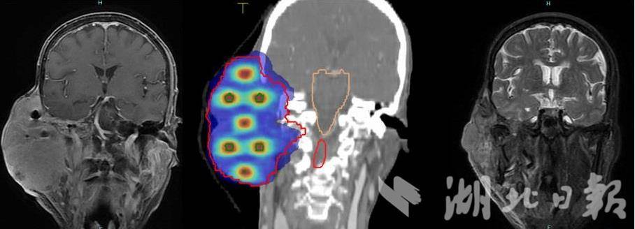放疗前后影像图(左边为入院时影像,右边为放疗结束后1个月复查影像,中间为晶格放疗剂量分布图)。(受访单位供图)