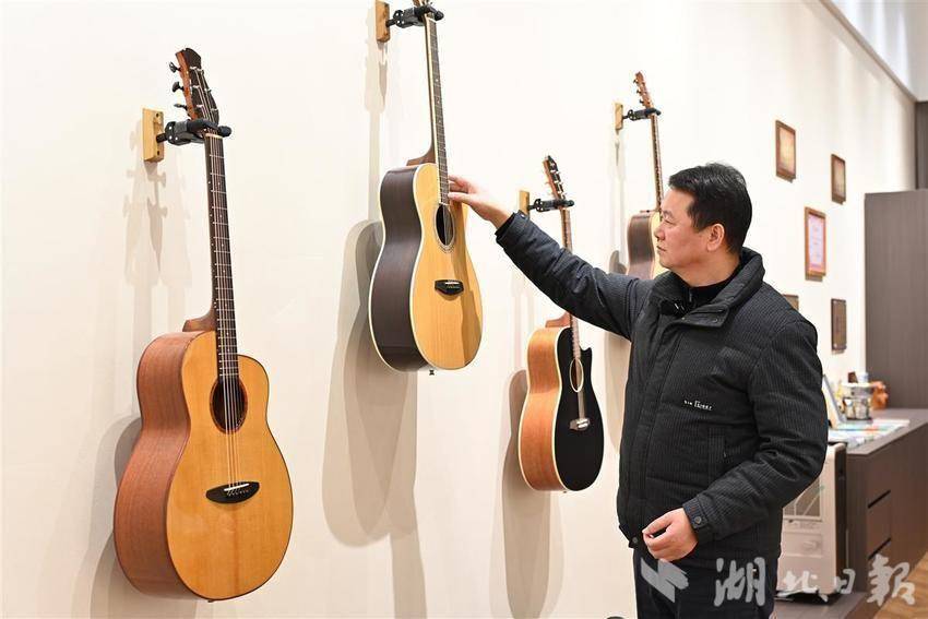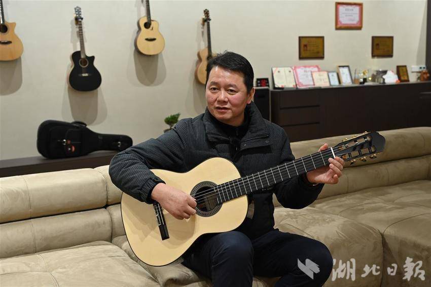 11月27日,湖北日报全媒记者一来到桐馨乐器的办公大楼,就听到吉他的乐声从楼上传来。循声走进位于2楼的办公室,只见一位精干的中年男人坐在沙发上,拨动着怀里的吉他。