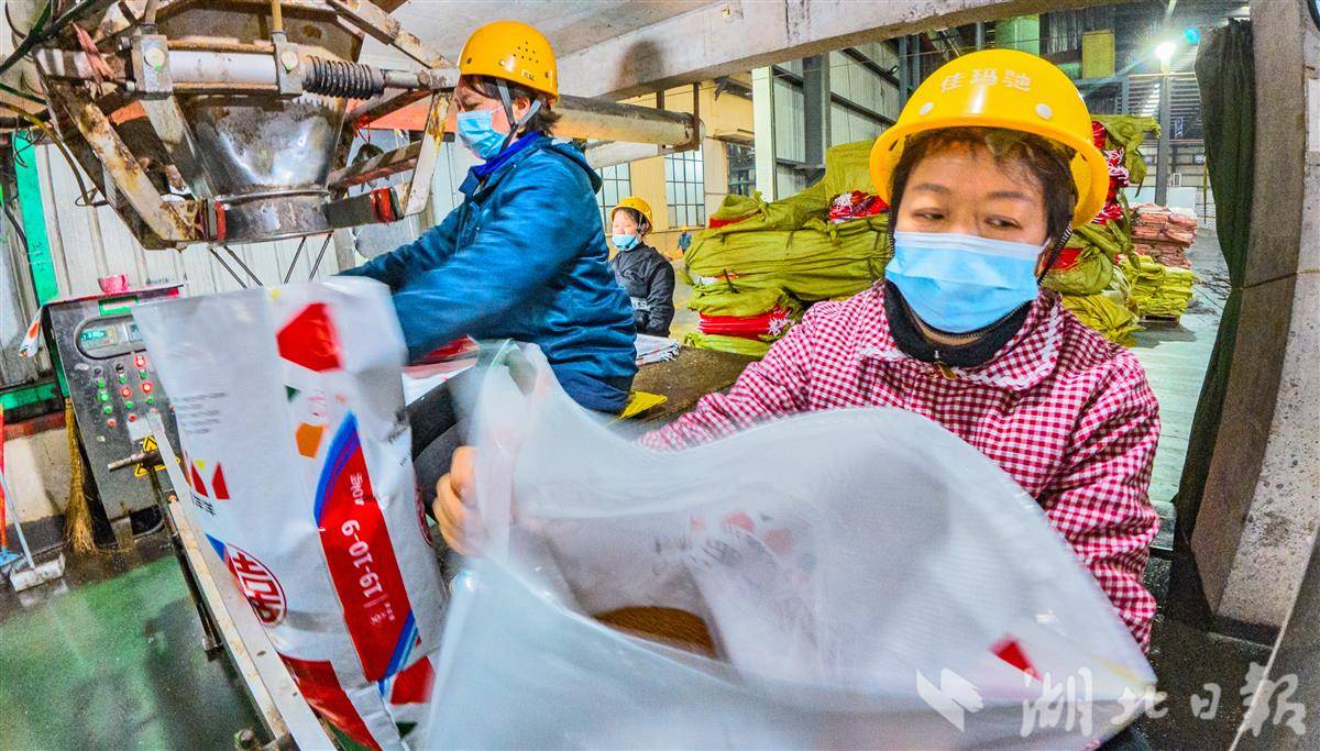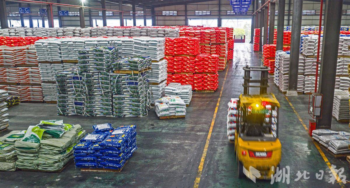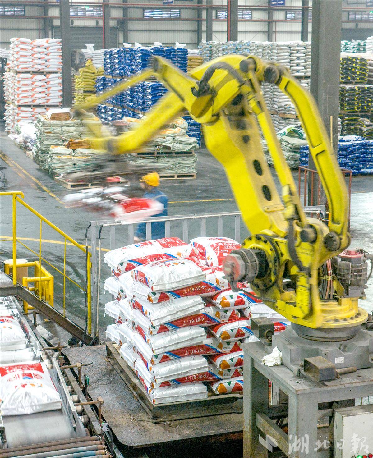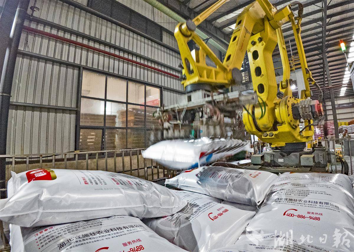 3月17日,在枝江市姚家港化工园湖北佳玛驰生态农业有限公司,自动化生产线高速运转,机械臂灵活作业、精准码垛,叉车往来穿梭,满载肥料的货车陆续驶出,源源不断运往各地田间地头,一派繁忙的春耕保供景象。