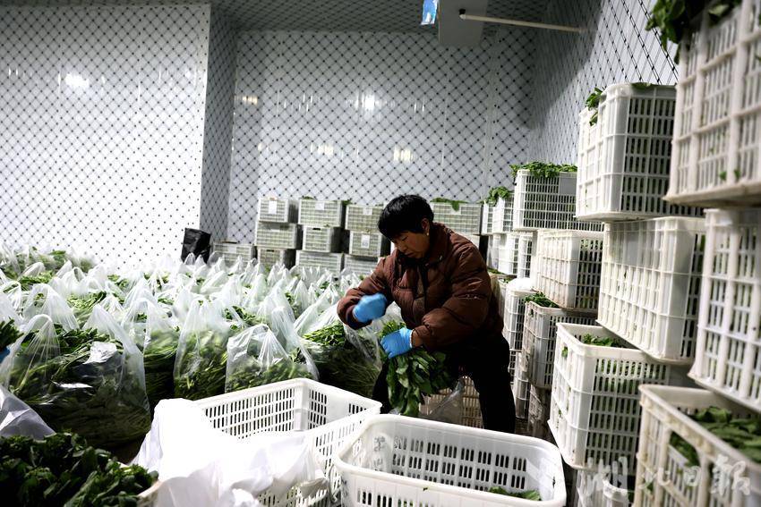 王金介绍,油菜薹采摘送检达标后,需先进入冻库醒菜8小时,再根据长短、外观等精细分选包装。新采用的“氮气+氧气”包装形式,保鲜期可达10天;针对高端市场推出精致小包装,通过空运实现“朝采夕至”,让清晨从田间摘下的菜薹,第二天就能出现在香港、北京等地超市的货架上。