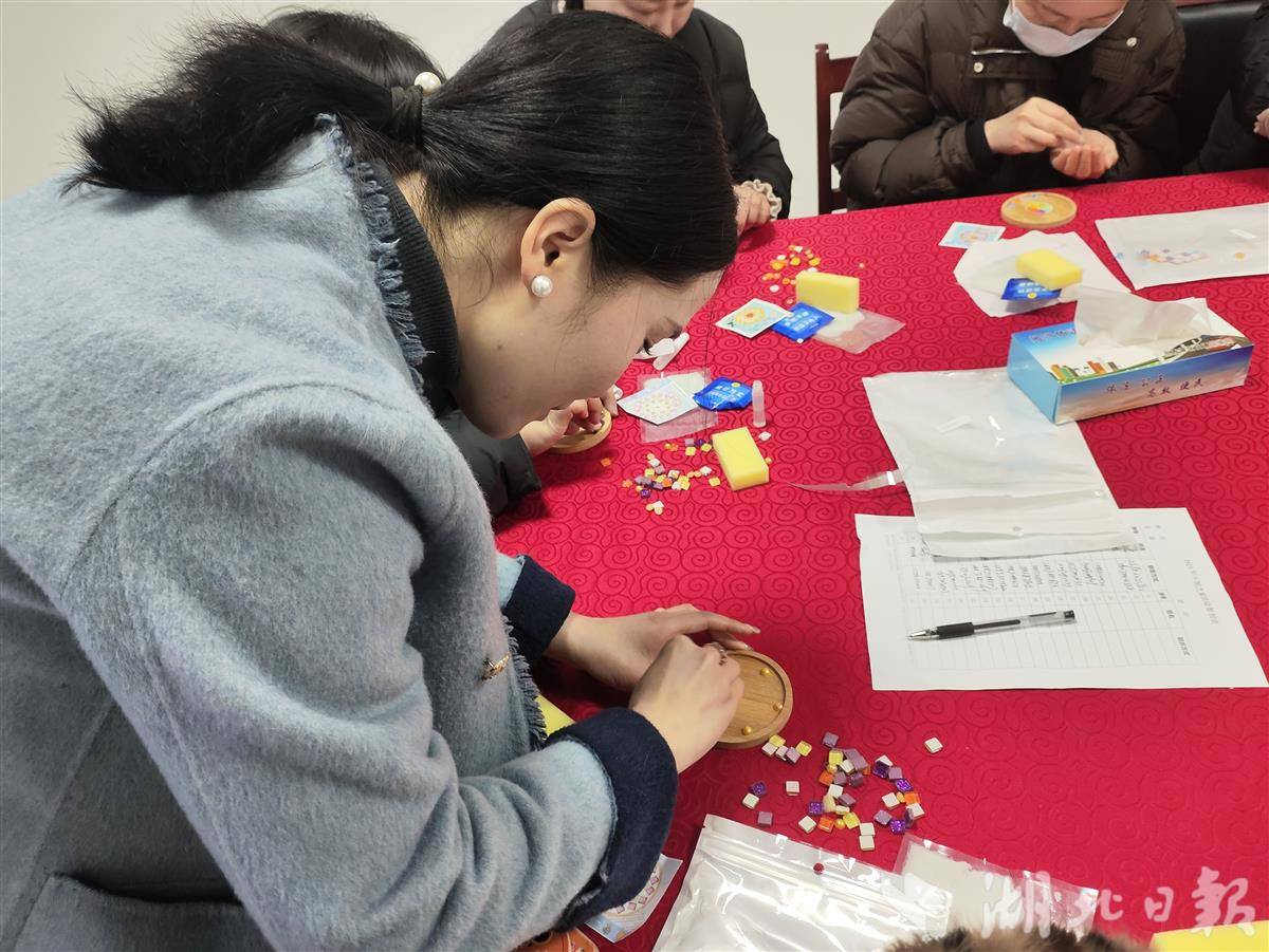 湖北日报讯(记者方琳、通讯员黄雯洁)3月17日上午,武汉市东西湖区金龙湾社区活动室里,十多位社区工作者围坐在桌边,安静地拼贴手中的马赛克碎片。这是径河街道社工站“沃土计划”第二期的一场活动,主题为“拼贴美好,治愈同行”。