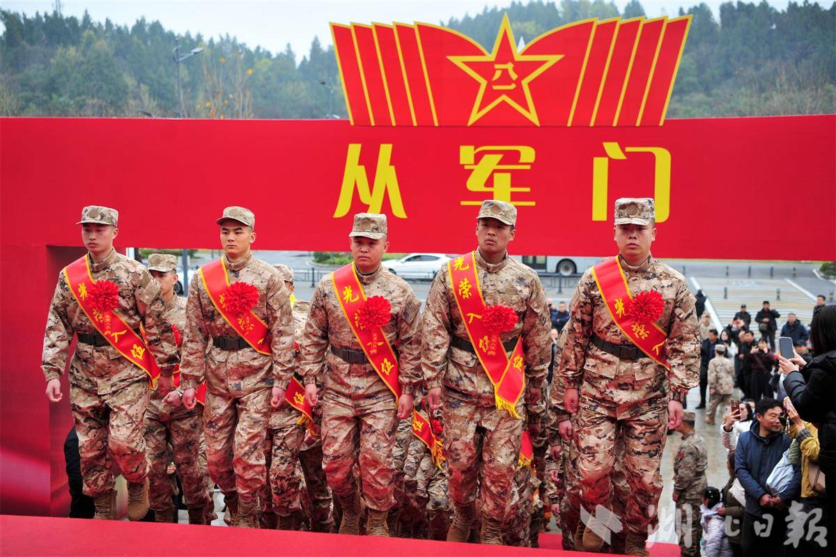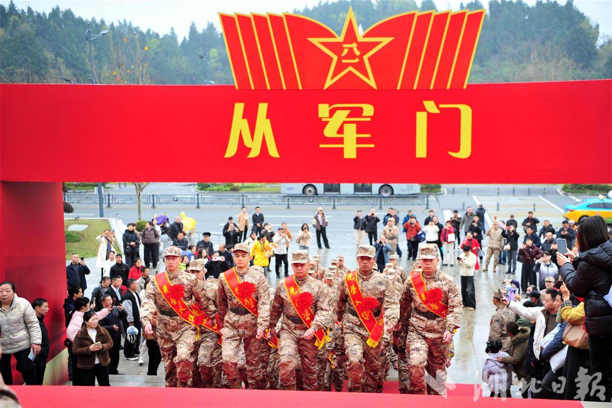 新兵在家长和市民的欢送中列队依次穿越“从军门”。