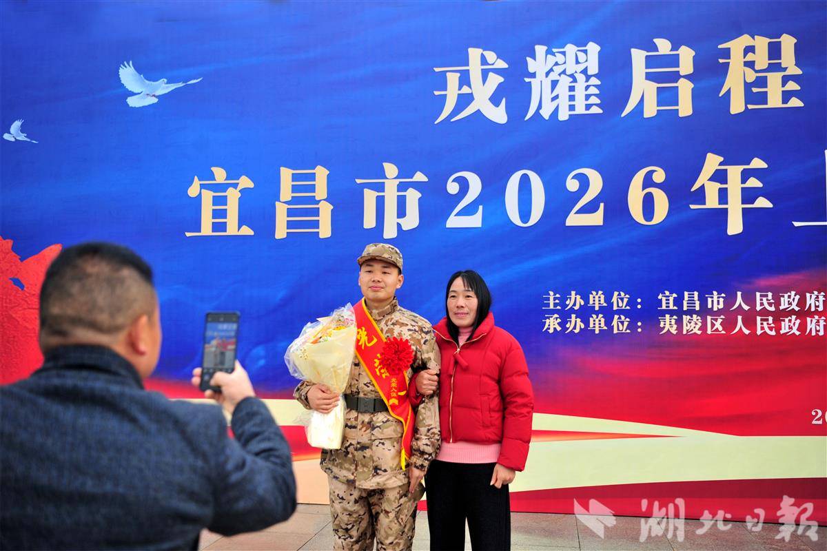 家长和新兵在宜昌市夷陵文化中心的2026年上半年新兵入伍欢送会上一起合影。