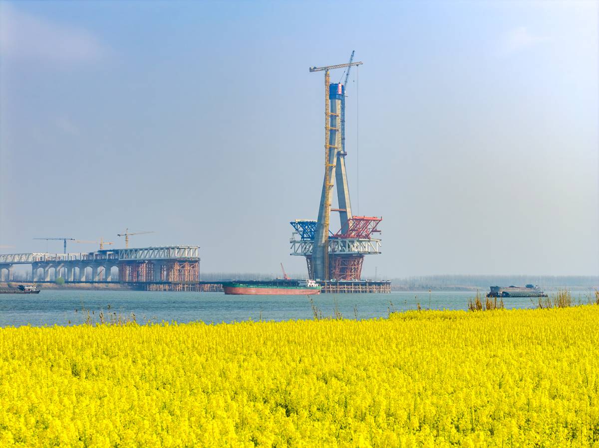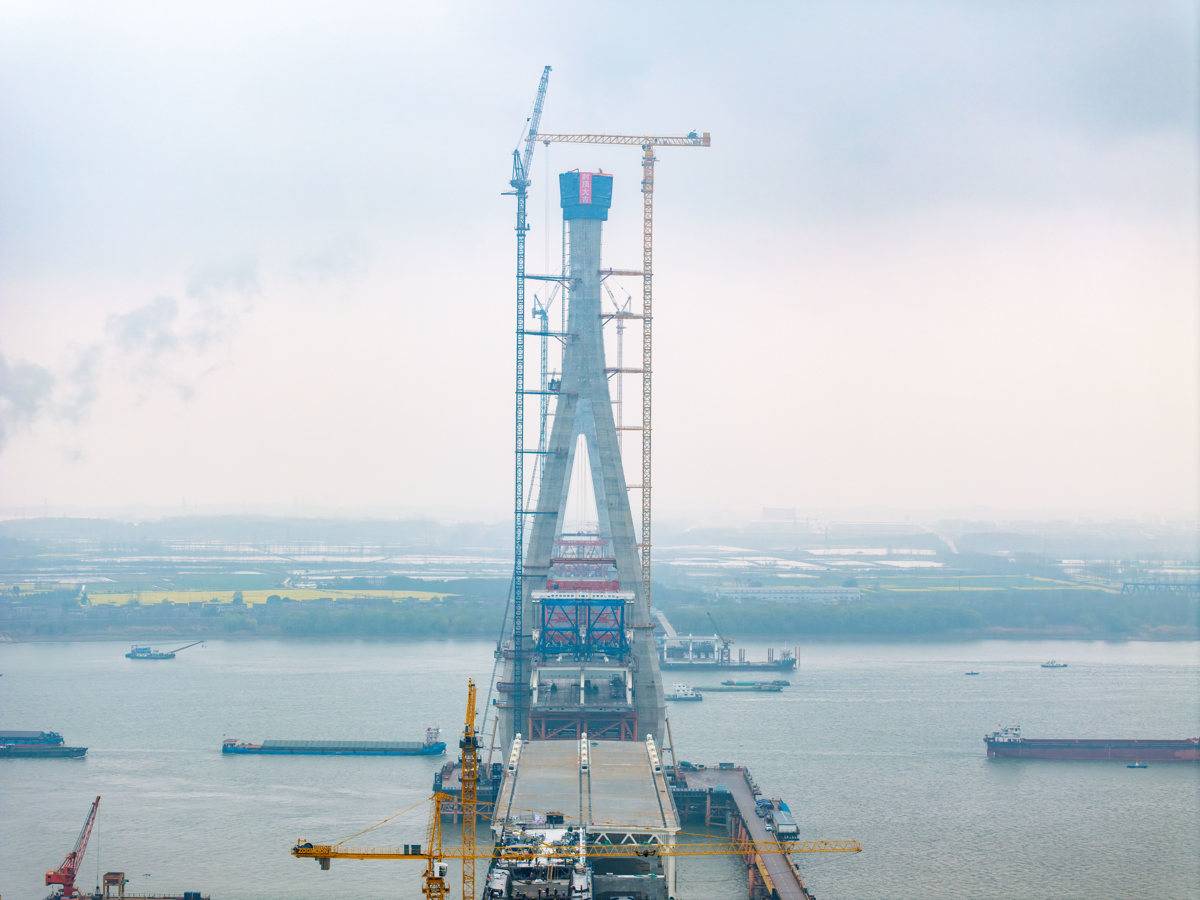 大桥设有两座主塔,其中4号南主塔高272.7米,3号北主塔高282.7米,均为造型优美的空间钻石型钢筋混凝土桥塔,有“天空之桥”的美誉。此次封顶的3号北主塔共设为47节浇筑,作为未来大桥的“脊梁”,它将和南主塔一起,通过324根钢索,稳稳承载起全长1768米、主跨812米的双层钢桁梁桥面,让汽车、高铁与城际列车在70米高空并行穿梭。