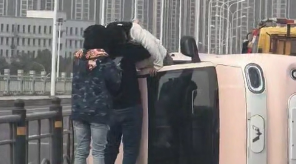 人被救出来了,车还倒在路上。几分钟后,两位“红骑侠”和他们的朋友出现了!他们是顺丰快递员吴李辉、张博文和好友赖日飞,三人正骑电动车路过,立刻关注到事故现场:护栏被撞歪,小车车轮悬空,女司机已被救出,正等待救援。