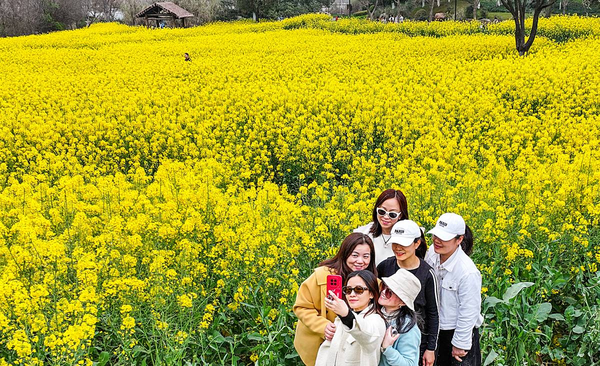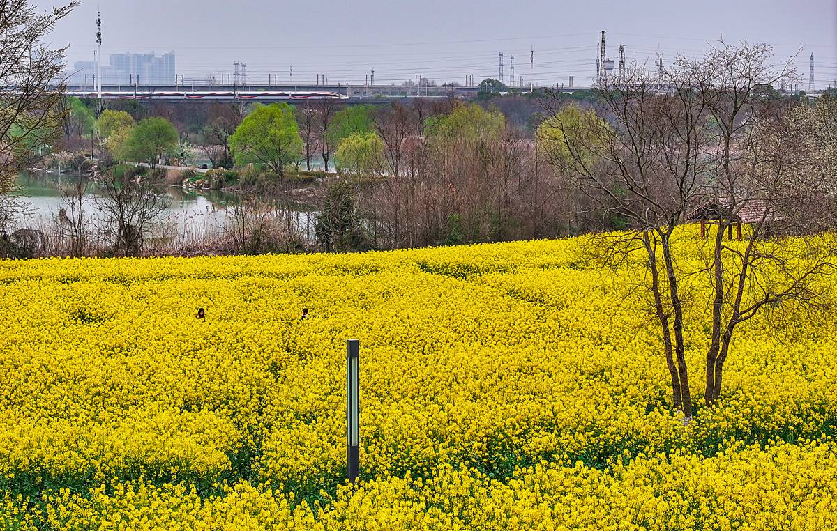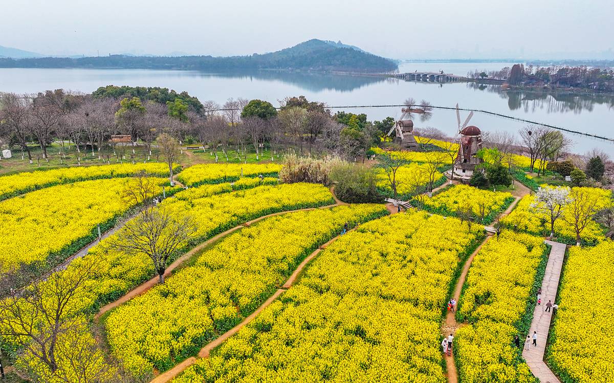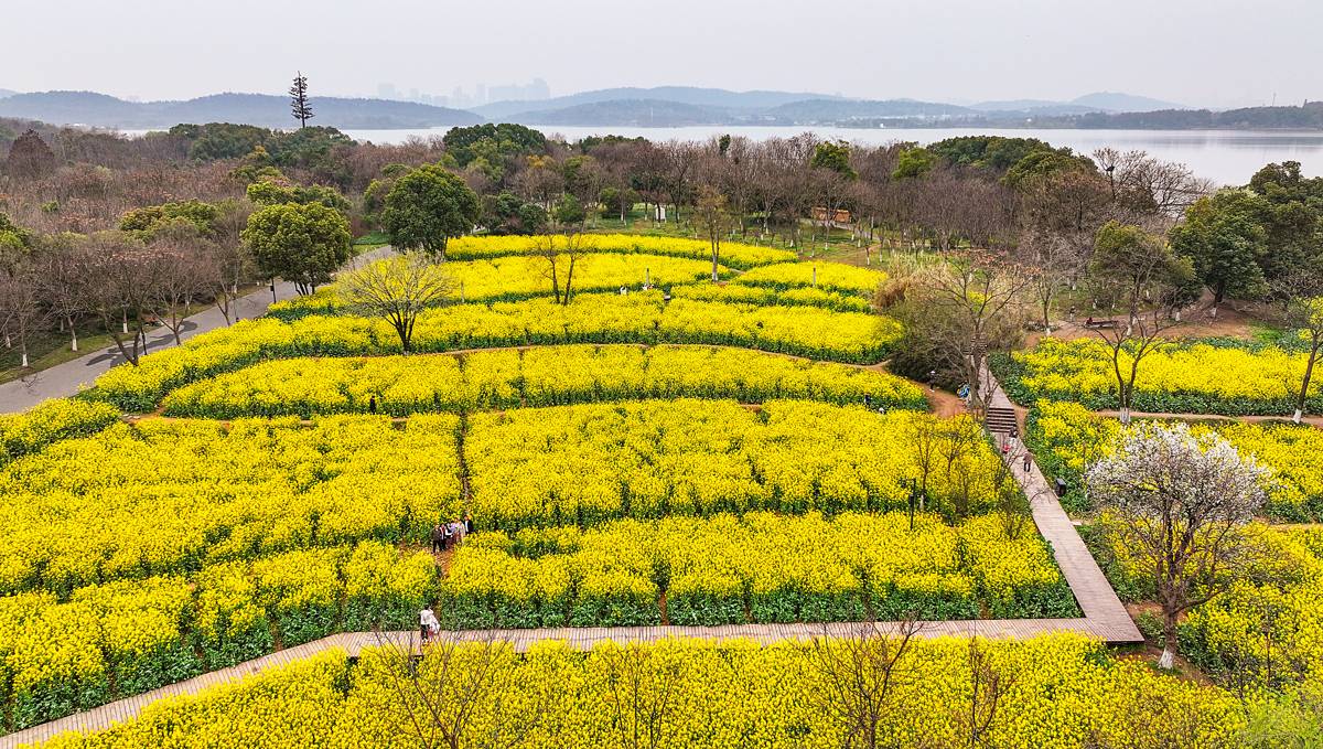 3月19日,春光灿烂,许多游人沿武汉东湖绿道的郊野道来到万国公园,这里30余亩的油菜花已盛开。金黄烂漫的油菜花错落有致地分布在湖边,层次丰富,一朵朵小黄花次第绽放,随风摇曳,小蜜蜂在花间萦绕,空气中弥漫着淡淡的花香,沁人心脾。