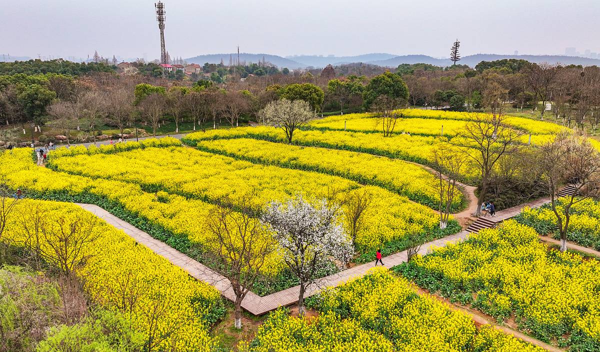 3月19日,春光灿烂,许多游人沿武汉东湖绿道的郊野道来到万国公园,这里30余亩的油菜花已盛开。