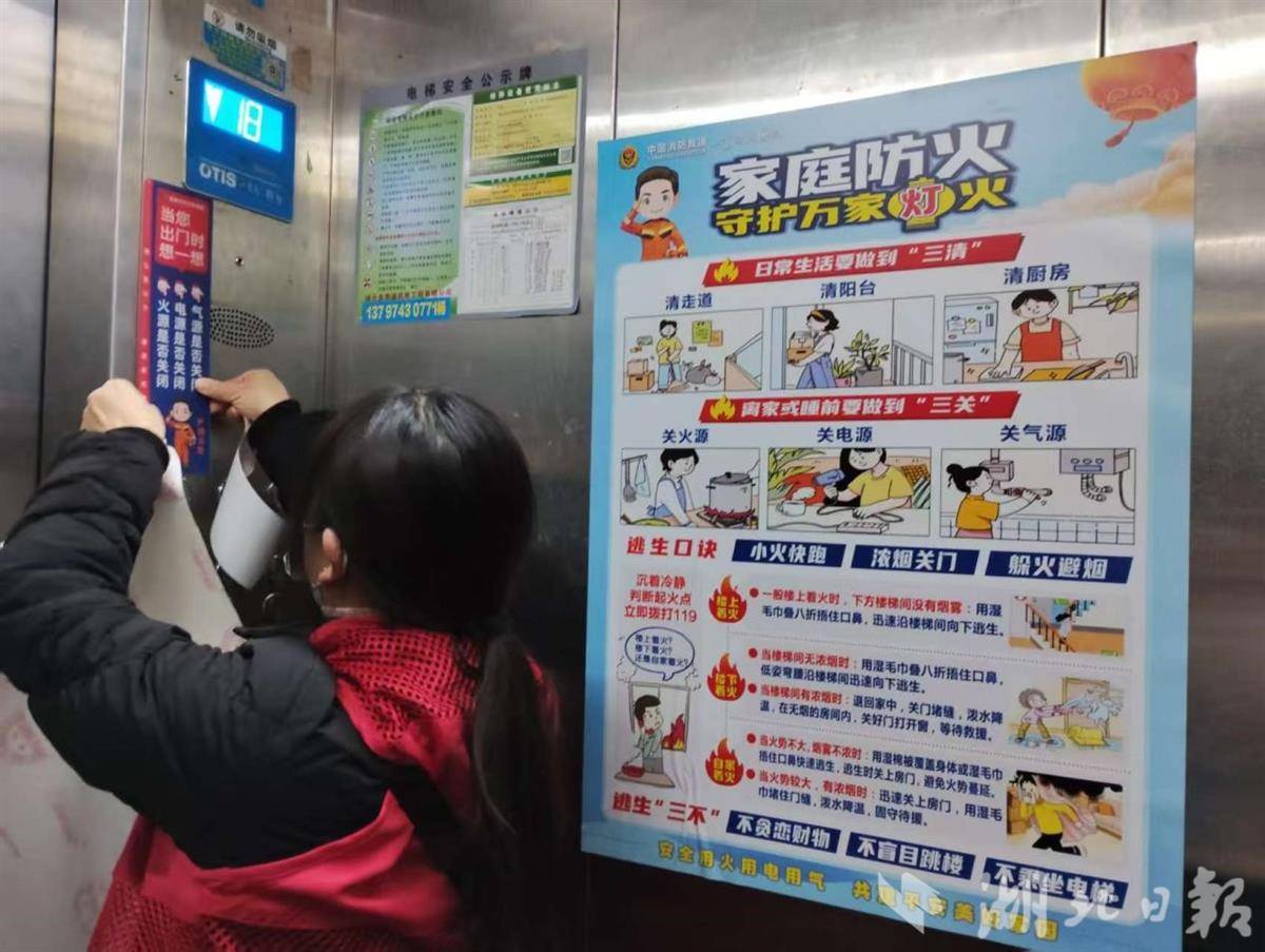 咸宁市消防救援局联合社区志愿者对辖区高层建筑电梯内张贴提示标语。 艾琳/摄