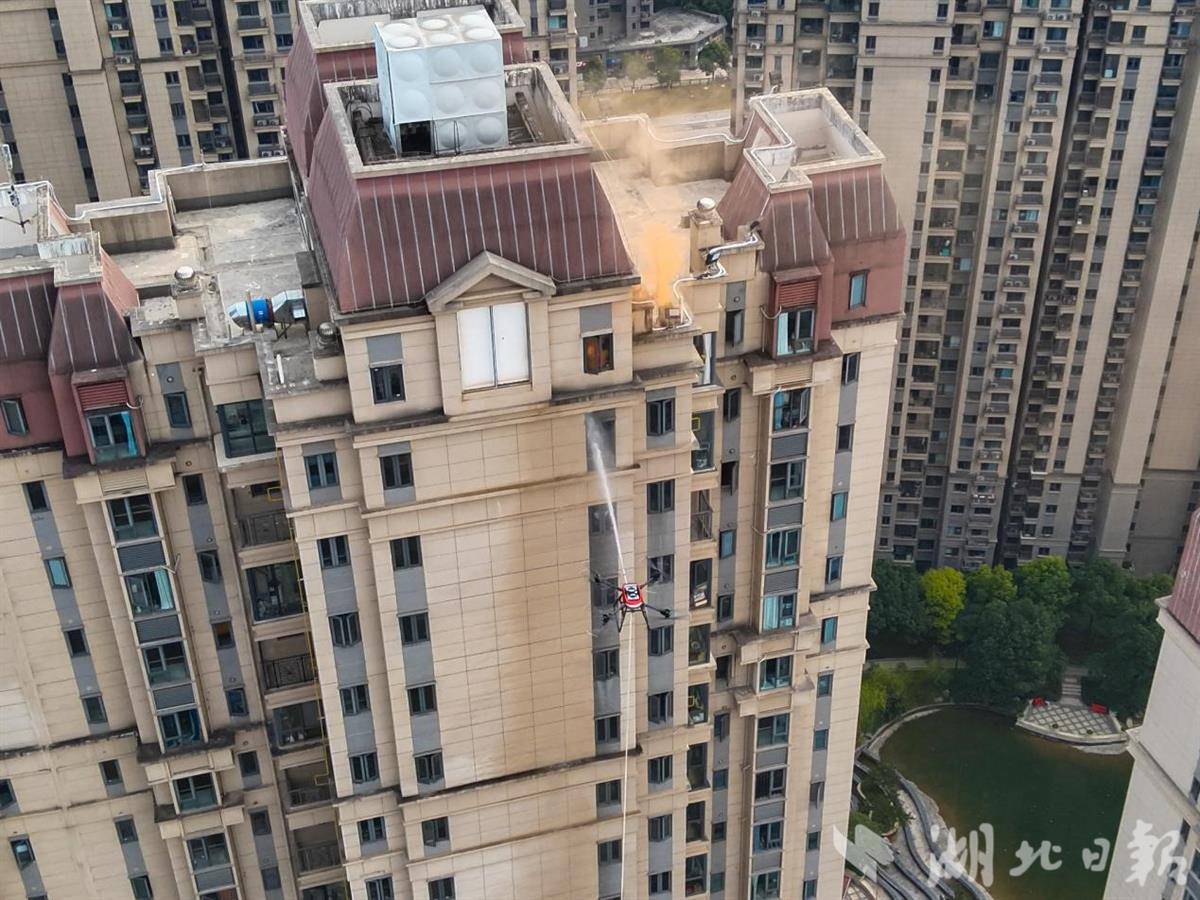 宜昌市消防救援人员在高层住宅建筑灭火演练中,使用无人机从建筑外部协同开展百米高空灭火 杨凌骁/摄