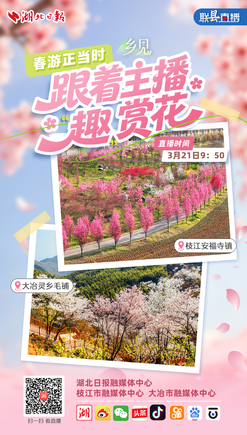 3月21日9:50,湖北日报联动枝江市融媒体中心、大冶市融媒体中心,带您云端共赴这场春日盛宴,解锁赏花趣游新玩法,看一朵花如何催热“春日经济”。