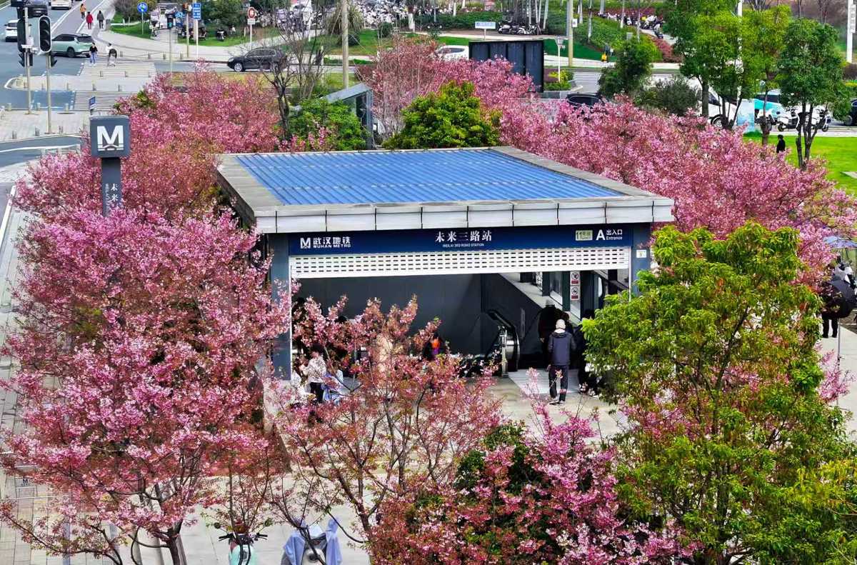 湖北日报讯(记者杨千帆、通讯员李丹、产启斗)春光明媚,繁花缀城。在武汉东湖高新区高新大道和左岭大道交汇处,地铁11号线未来三路地铁站A出入口处,数排樱花树次第绽放。粉红色花瓣随风轻扬,温柔环绕着整个出入口,如同一幅灵动的春日画卷走红网络,被誉为“最美地铁出入口”。
