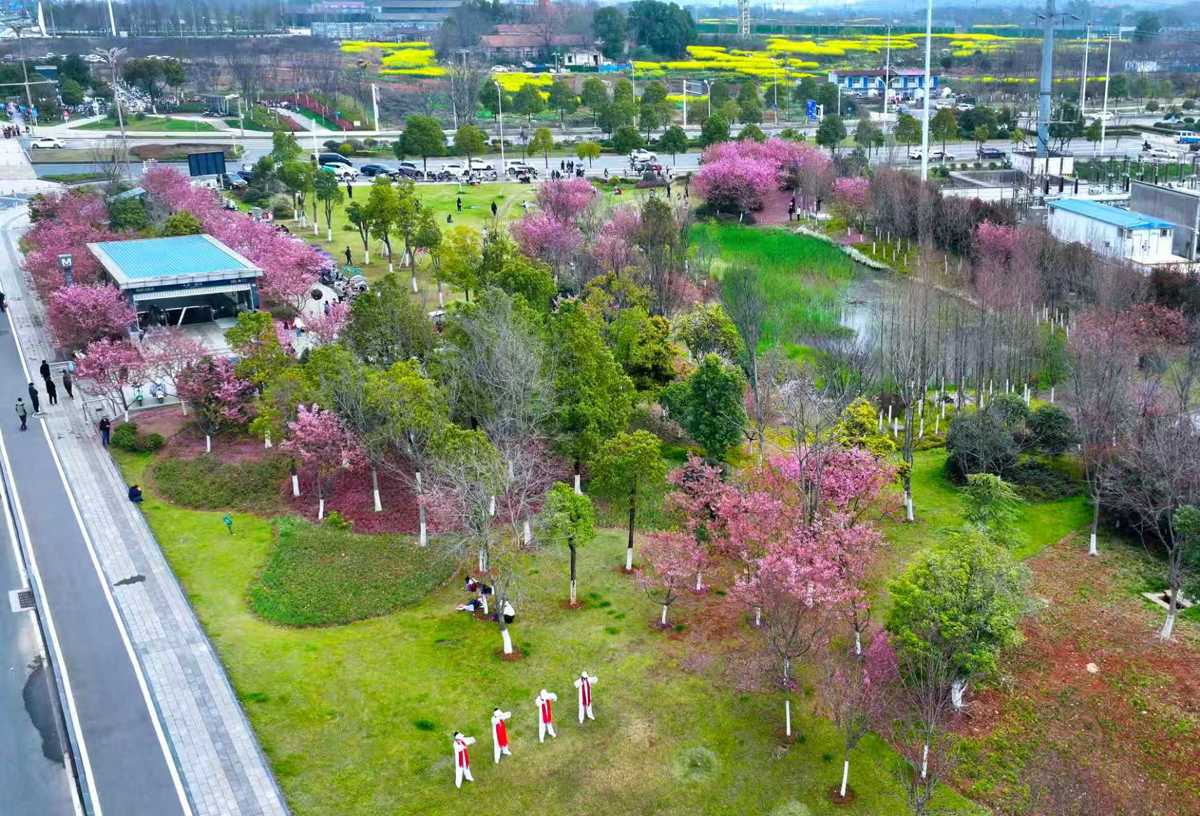 3月19日下午3时许,暖阳正好,家住车站附近的陶女士一行数人,来到未来三路站街边公园内练太极,随后换上靓丽的服饰,在出入口樱花树下拍照打卡。“这里的景色太美了,我们老年健身队特意错峰过来,既能健身休闲、舒展身心,又能打卡赏樱,尽情感受春天的美好与浪漫。”陶女士言语间满是喜悦与满足。