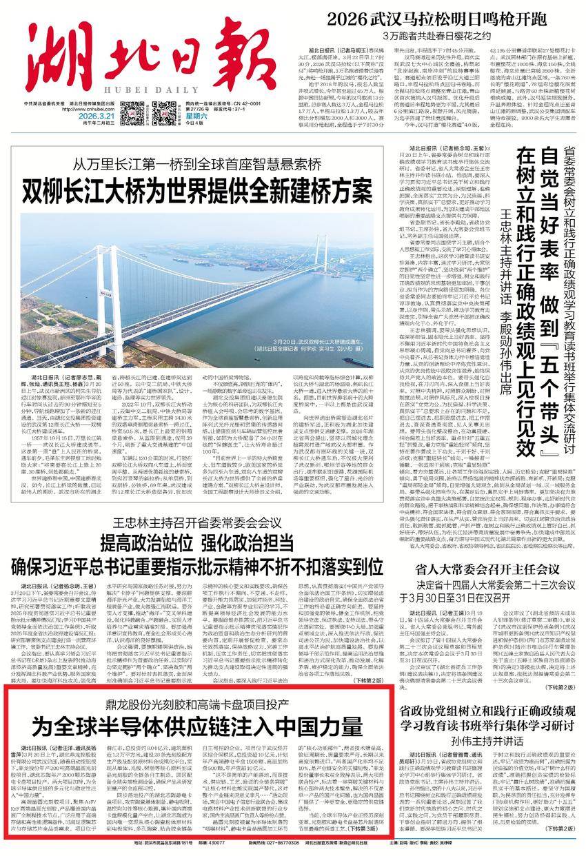 ▲3月21日,湖北日报头版转要闻报道:鼎龙股份光刻胶和高端卡盘项目投产为全球半导体供应链注入中国力量