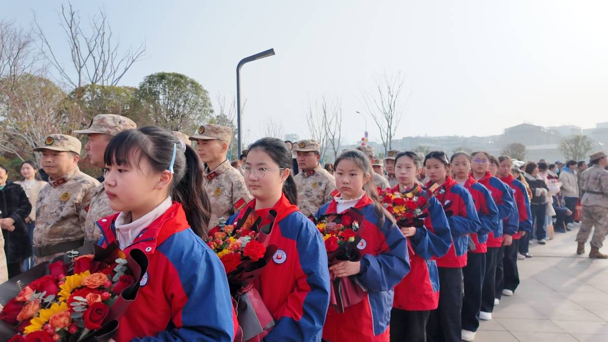 来自大悟县礼山小学的少先队员们为即将奔赴军营的新兵们献上鲜花,退役老兵为新兵佩戴入伍纪念章。激昂嘹亮的《中国人民解放军军歌》奏响,全体人员齐声合唱,旋律振奋人心。