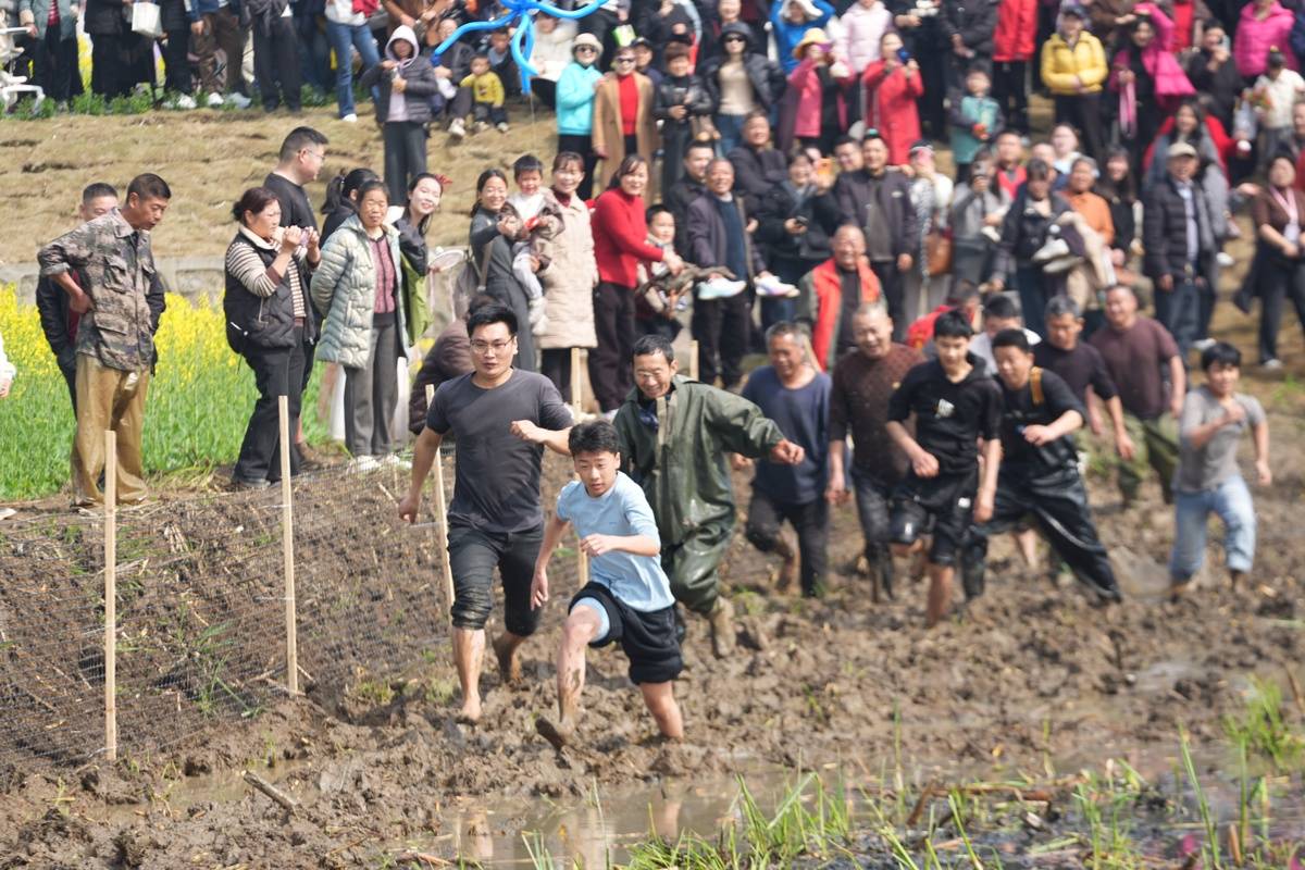 泥地捉鸭、农人三项、土味拔河等沉浸式体验活动,更让游客零距离体验乡土乐趣,让春日的田野成欢乐的海洋。当阳好礼展销区现场人头攒动,郭场鸡、长坂坡土榨菜籽油、新鲜果蔬等农特产品深受青睐。