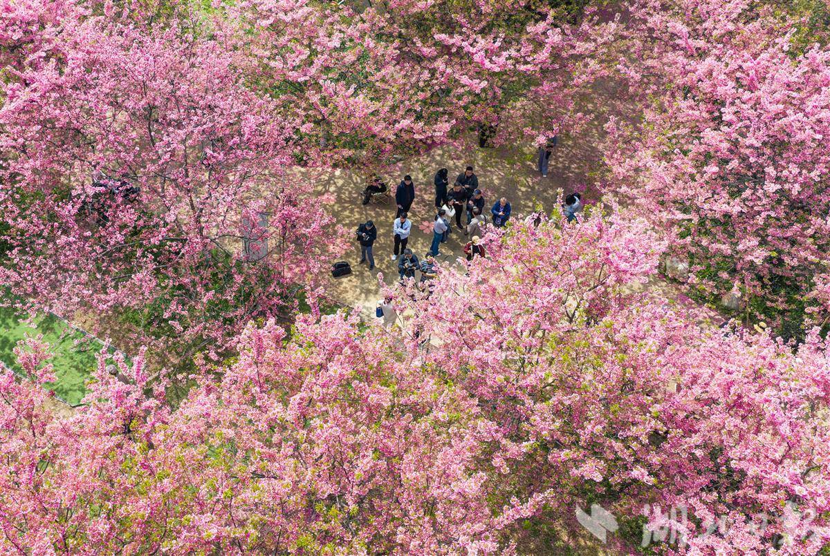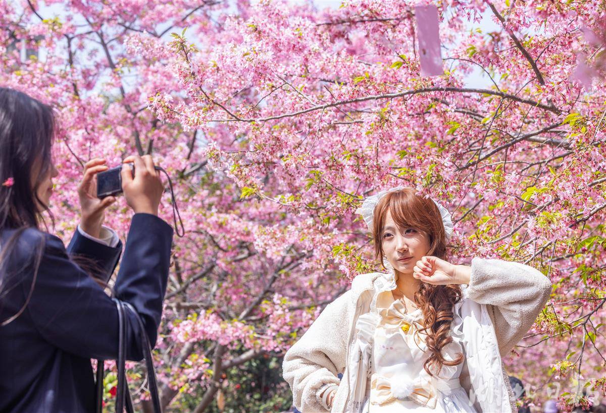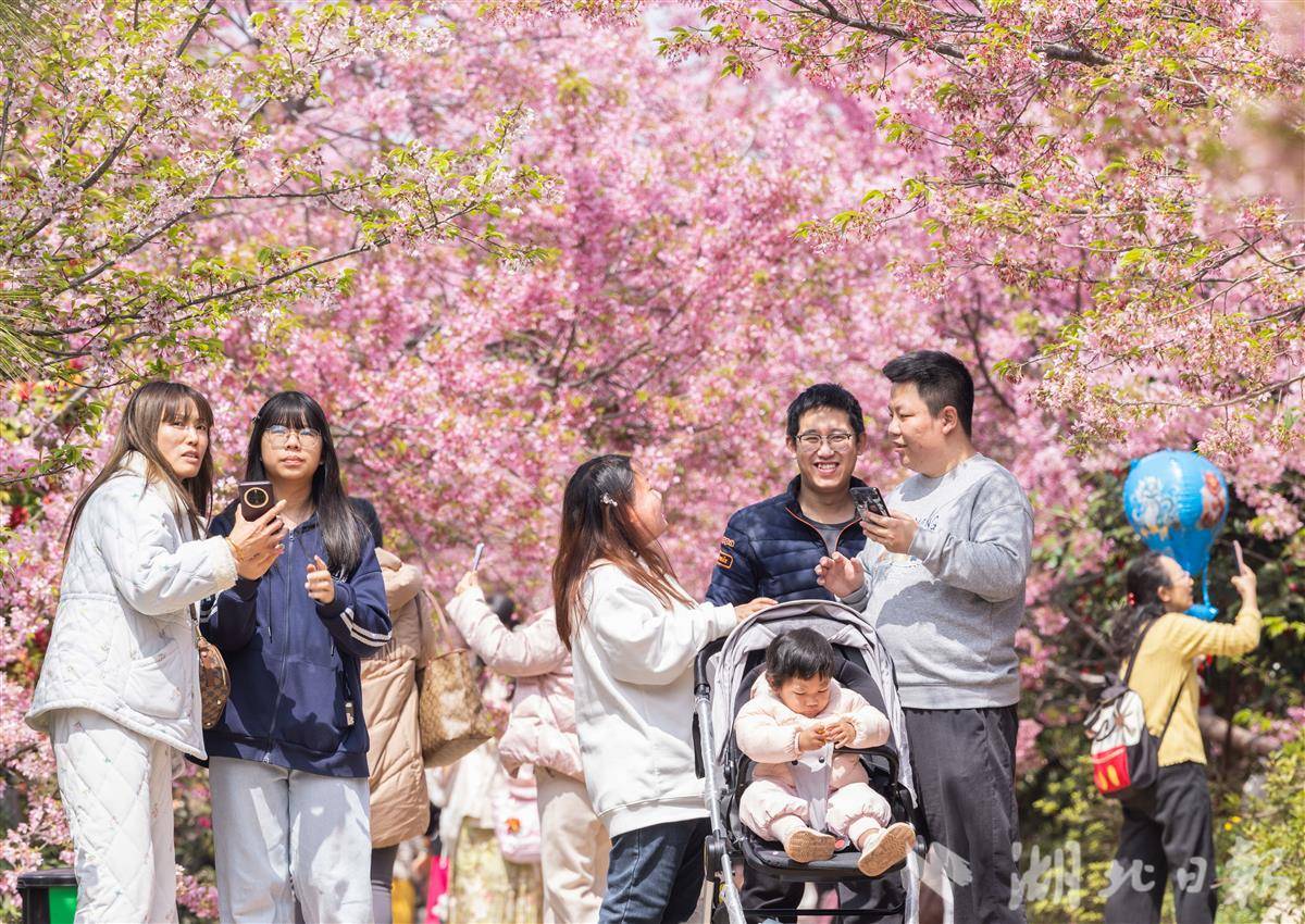 3月21日,武汉长江新区楚风樱海园内,前来赏樱打卡、休闲游玩的游客络绎不绝。
