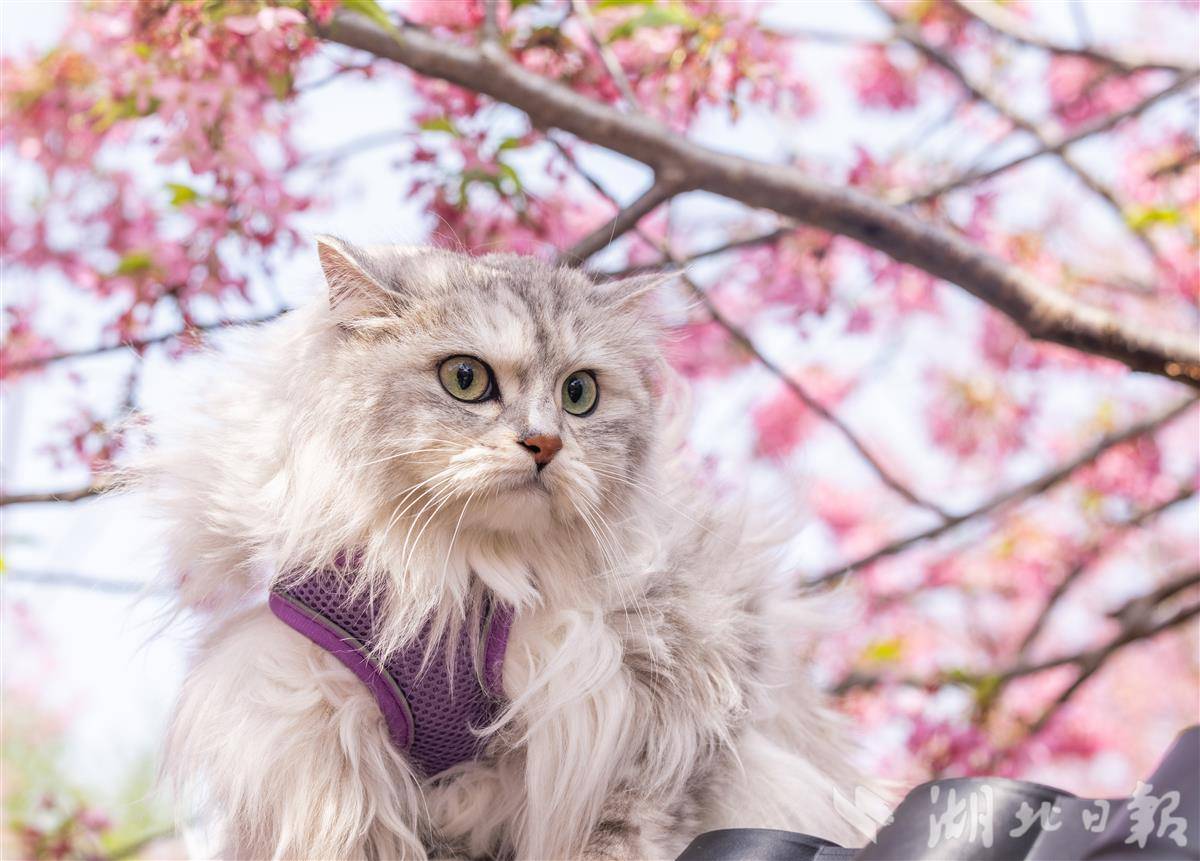 3月21日,武汉长江新区楚风樱海园内,游客带宠物来打卡。
