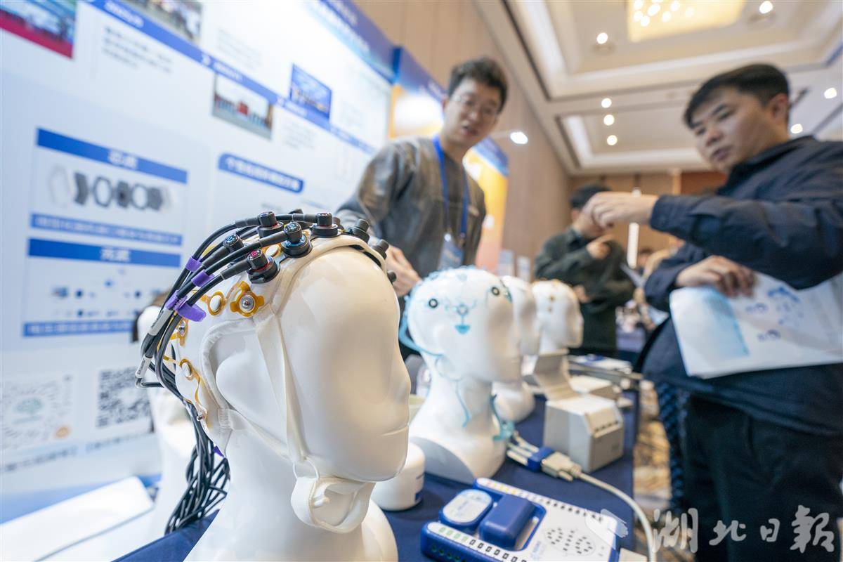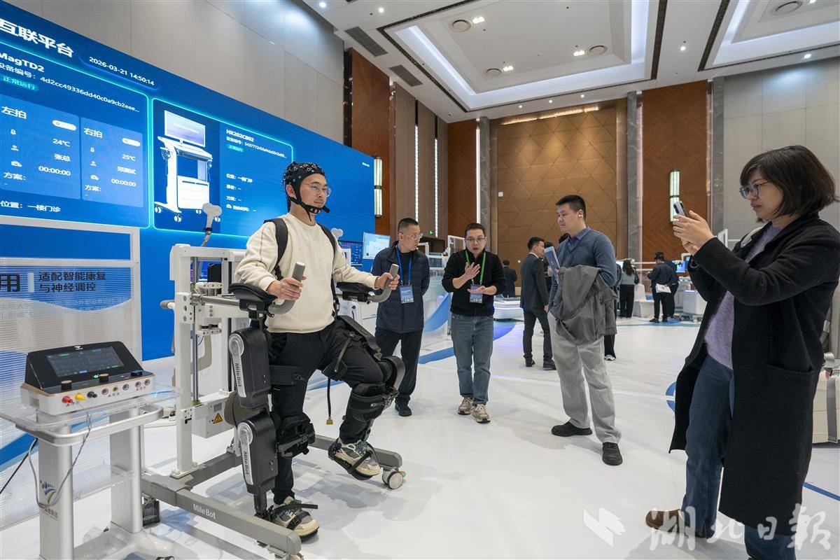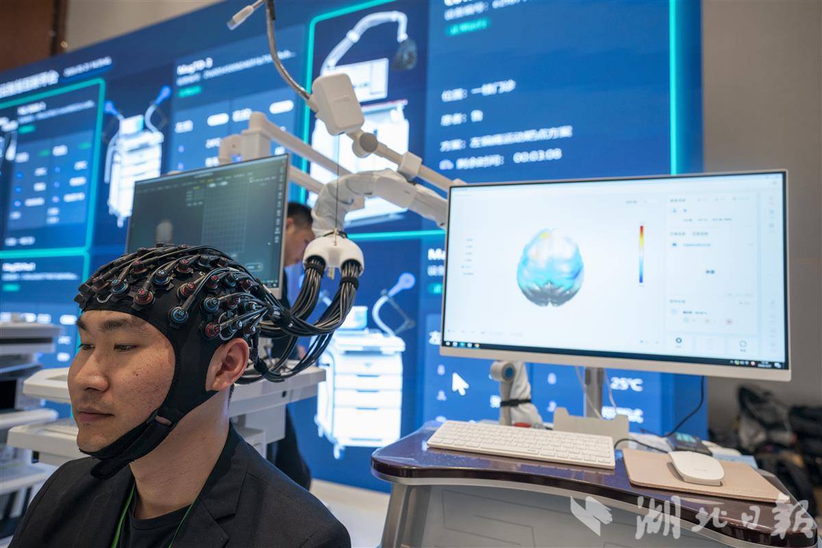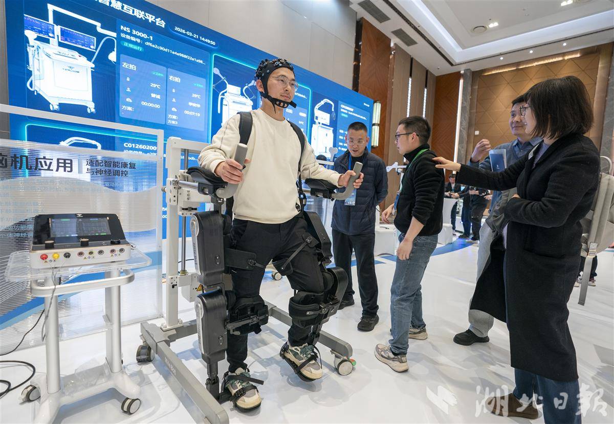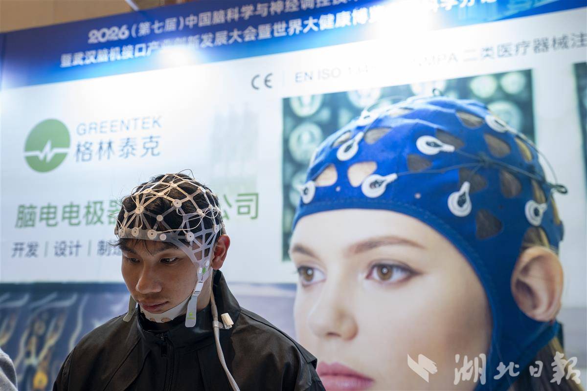 3月21日,2026年(第七届)中国脑科学与神经调控技术发展高峰论坛暨武汉脑机接口产业创新发展大会在汉开幕,全国各地脑科学研究、脑机接口产业的专家学者、企业家齐聚一堂,共话脑机接口与神经调控领域新技术、新产品、新应用的未来医疗新愿景。在活动现场设置的“无创脑机与神经调控新场景新产品新技术体验区”,通过真实模特演示、设备联动,将复杂技术转化为可视可感的医疗场景,系统展示了从检测、解码、调控到反馈的完整技术闭环,展望了中风、抑郁症等脑科疾病的脑机治疗解决方案。(湖北日报全媒记者 魏铼 摄)