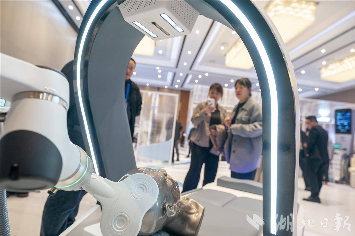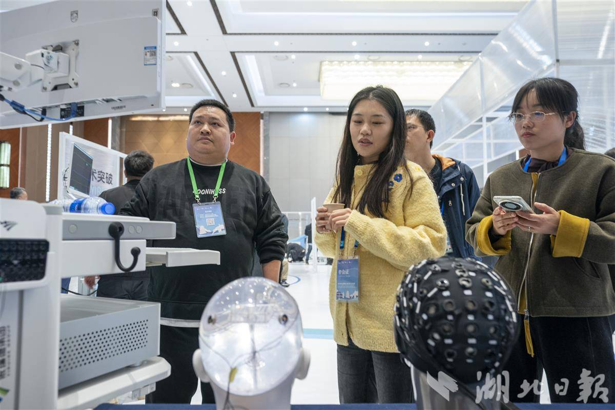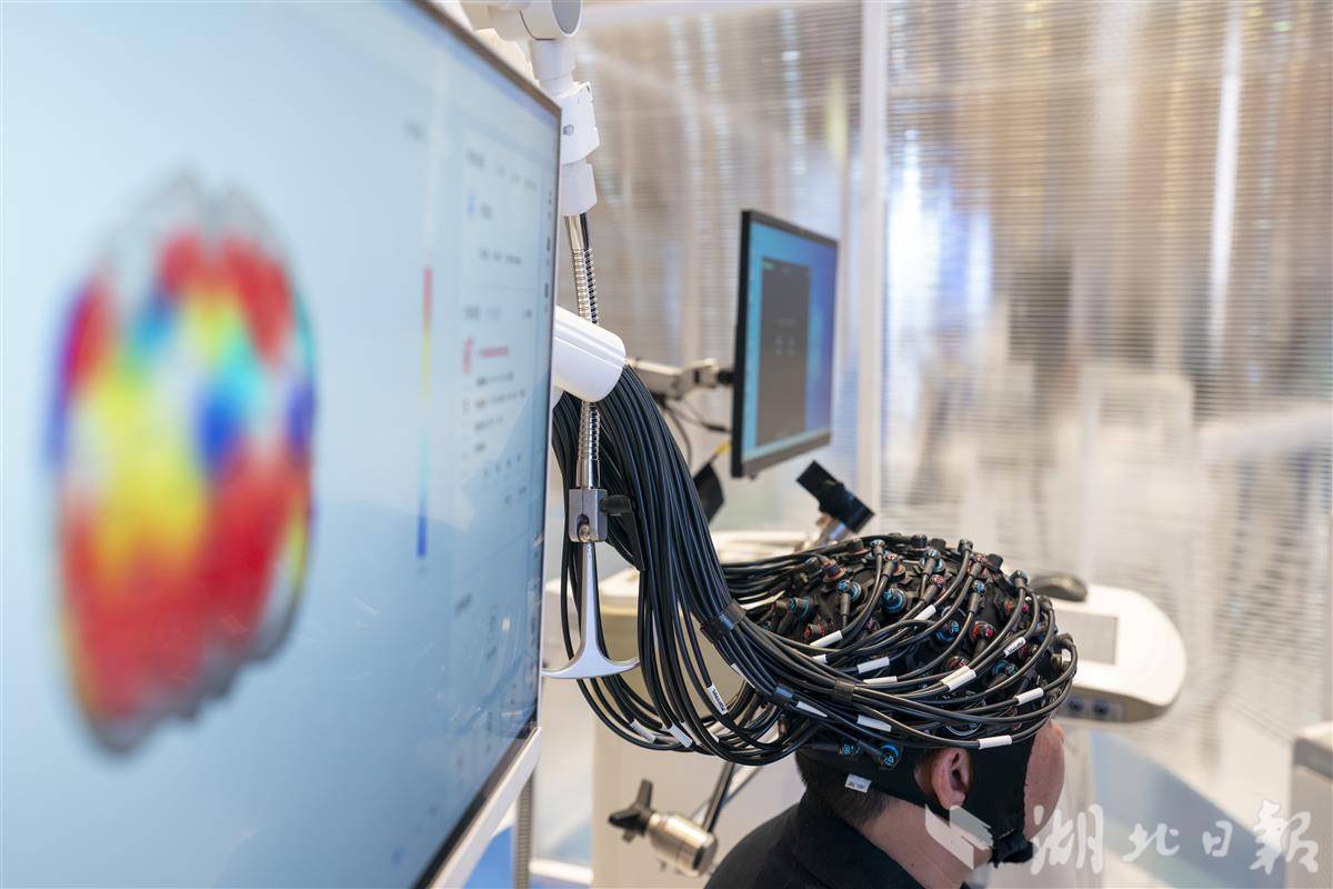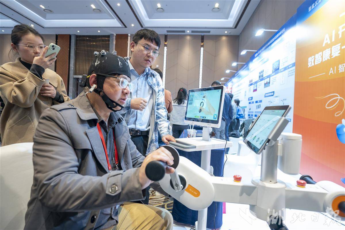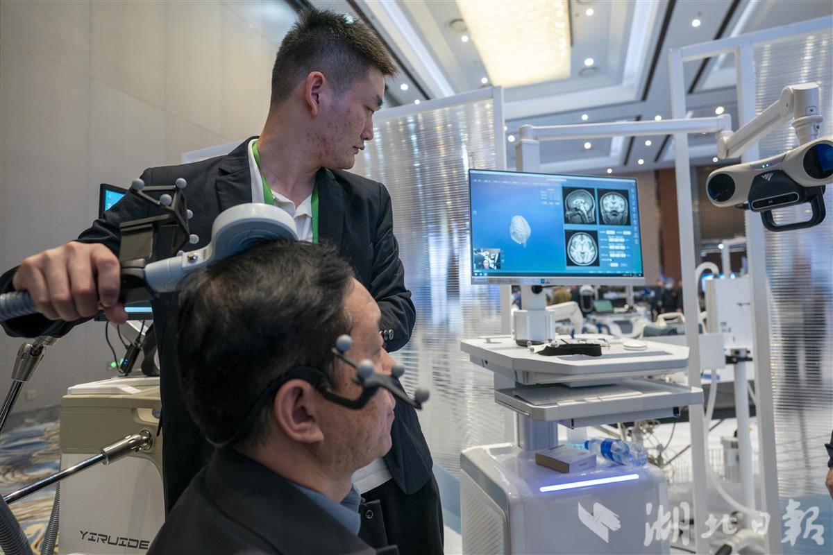 3月21日,2026年(第七届)中国脑科学与神经调控技术发展高峰论坛暨武汉脑机接口产业创新发展大会在汉开幕,全国各地脑科学研究、脑机接口产业的专家学者、企业家齐聚一堂,共话脑机接口与神经调控领域新技术、新产品、新应用的未来医疗新愿景。在活动现场设置的“无创脑机与神经调控新场景新产品新技术体验区”,通过真实模特演示、设备联动,将复杂技术转化为可视可感的医疗场景,系统展示了从检测、解码、调控到反馈的完整技术闭环,展望了中风、抑郁症等脑科疾病的脑机治疗解决方案。(湖北日报全媒记者 魏铼 摄)