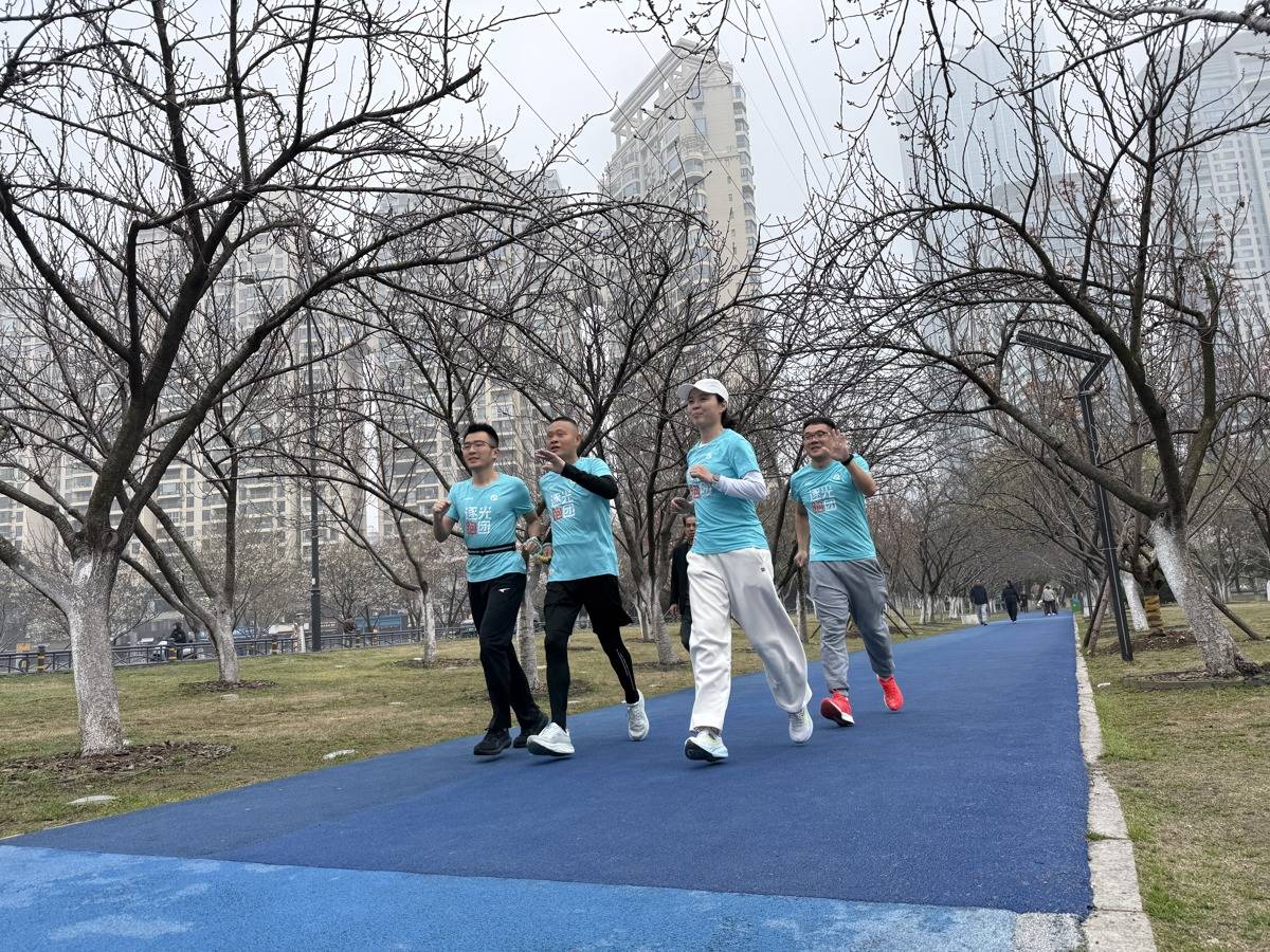 图为视障与听障跑者与志愿者一同在西北湖训练。