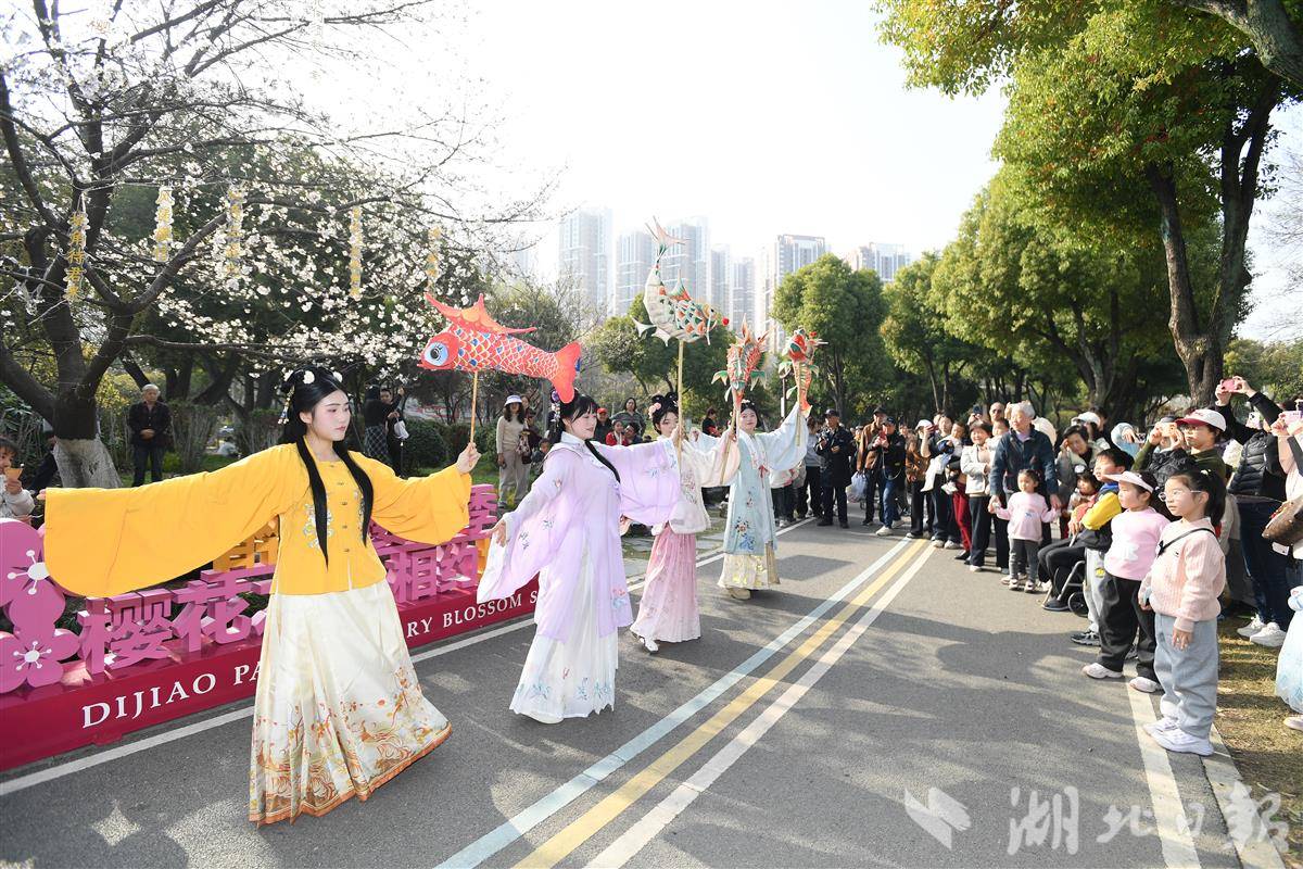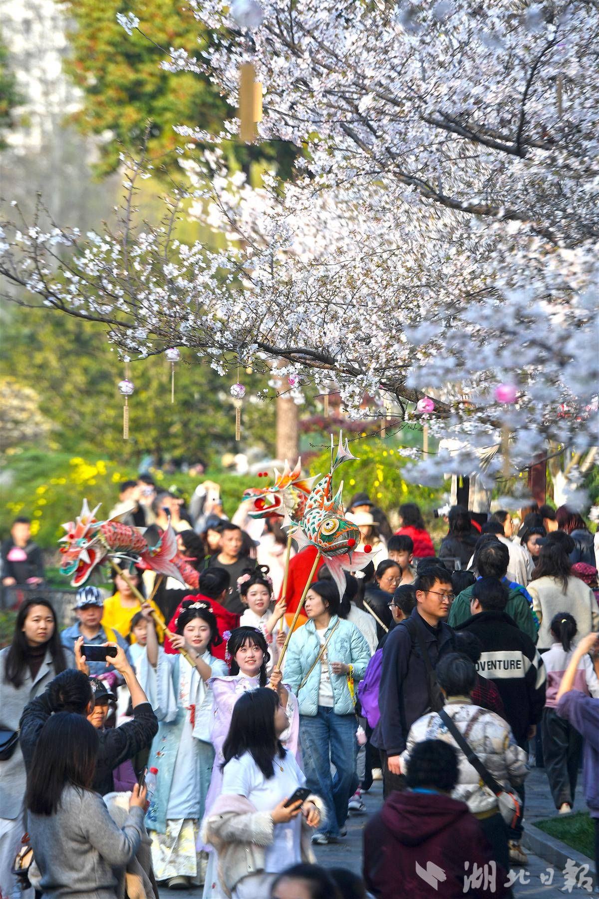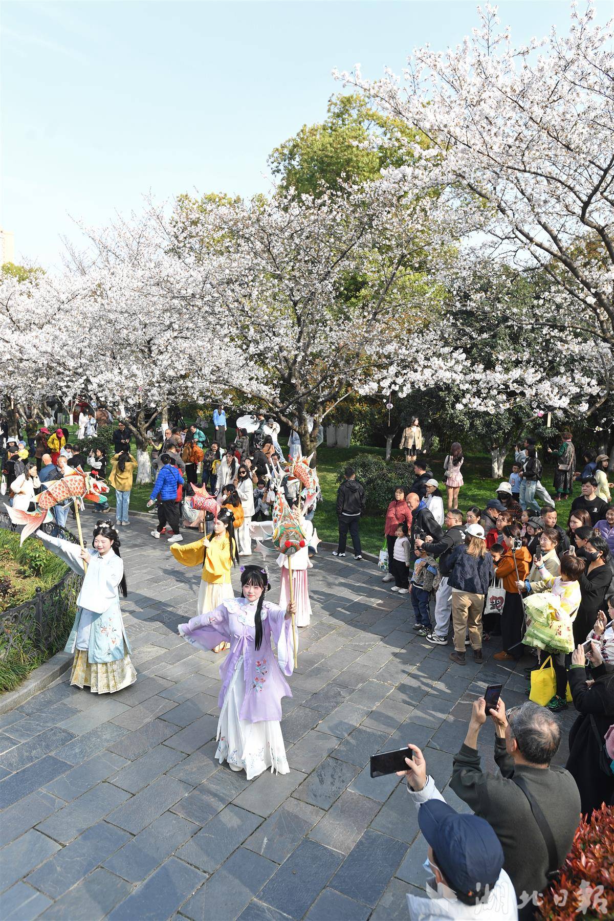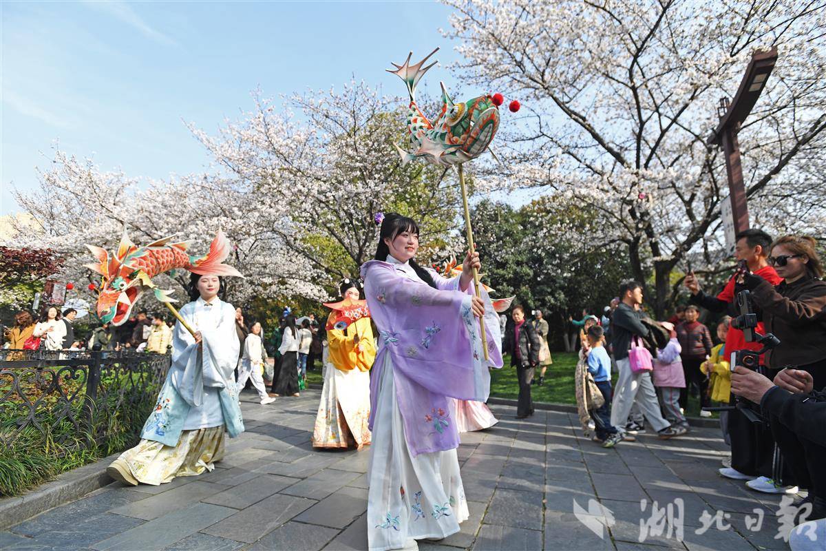 湖北日报讯(记者魏铼、通讯员何梦宇)春风执笔,樱花为墨,染就一城东方韵。3月21日,武汉堤角公园中的樱花进入盛花期。作为“武汉十大必打卡赏樱地”中唯一的江北胜景,这座拥有1300余株、22个品种樱花的江南园林,以“樱漫堤角·春满江岸”为主题,开启一场贯穿今古的国潮文化盛宴,国风市集、非遗鱼灯巡游、“风吟樱语”音乐会、《樱韵光影》摄影展等系列活动相继展开,让游客在樱花瓣雨中沉浸式体验“中式浪漫”。烂漫樱花纷飞处,非遗鱼灯巡游将活动推向高潮。身着汉服的角色扮演者手持非遗传承人亲手扎制的鳌鱼灯、青鱼灯等,在花间舞蹈、游弋穿行。鳞光闪烁间,飘落的樱花雨交织成画,重现“凤箫声动,玉壶光转,一夜鱼龙舞”的古典意境,尽显非遗与春日的浪漫碰撞。
