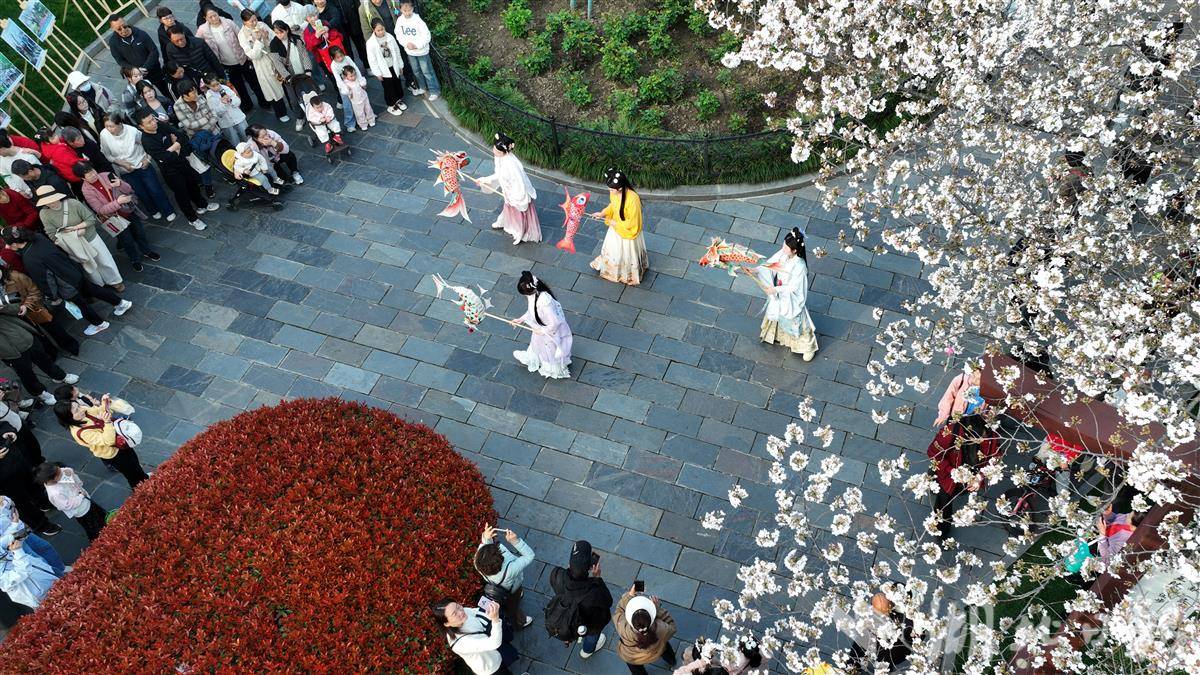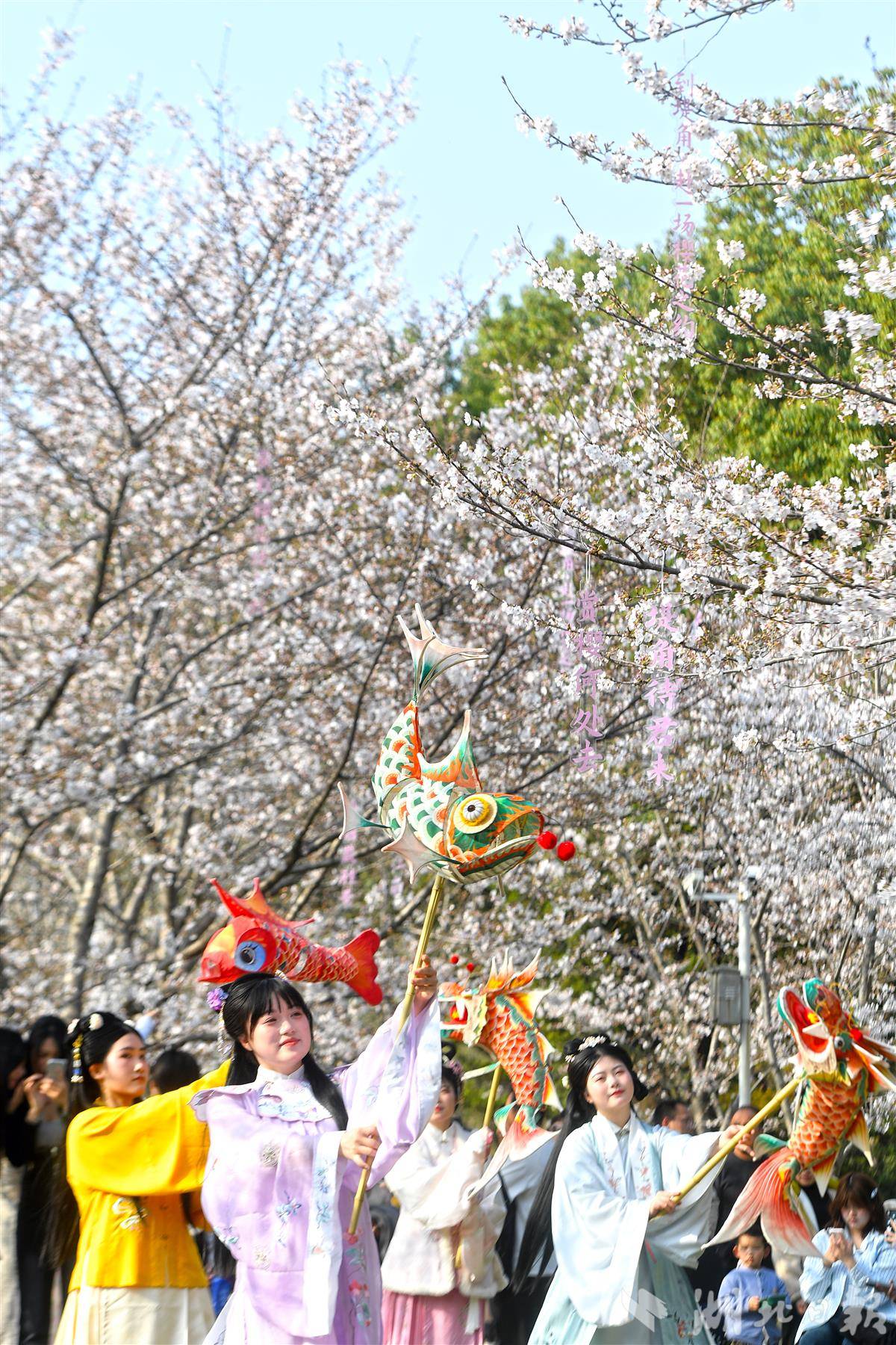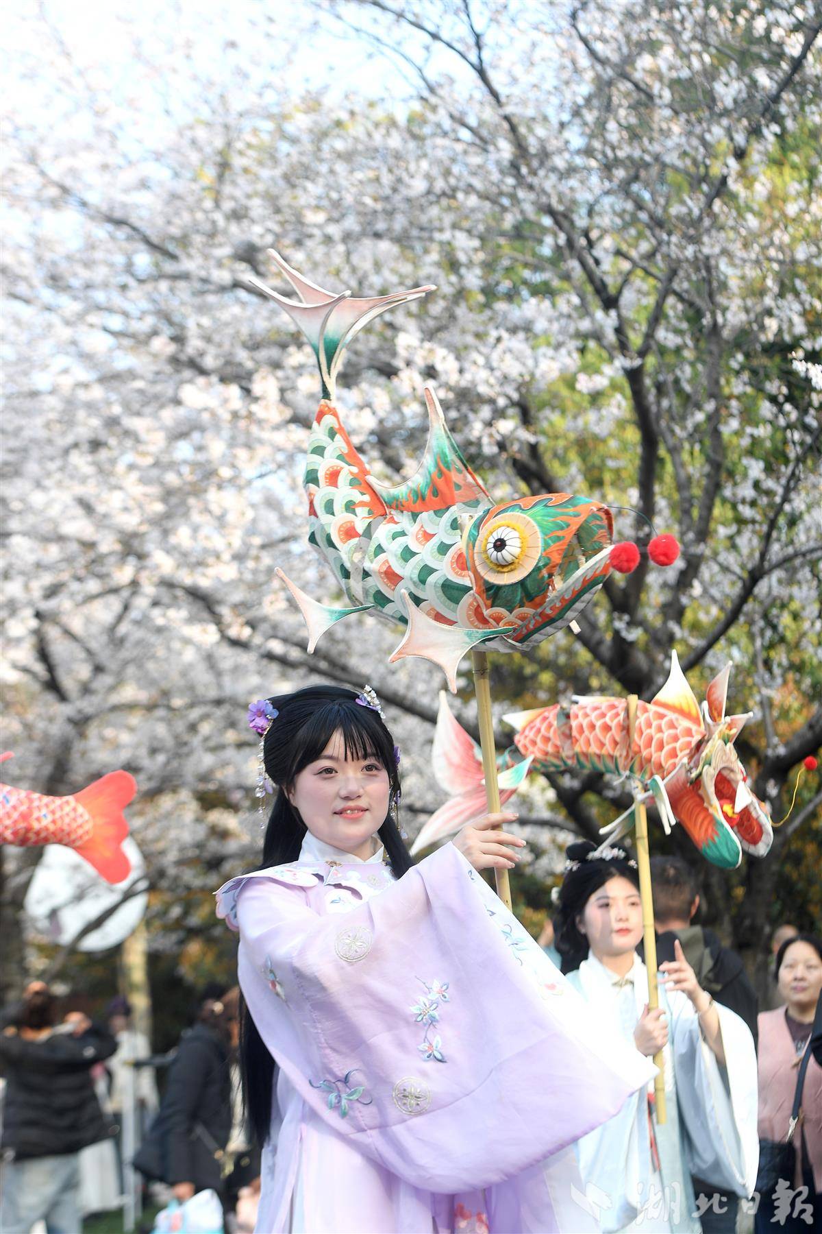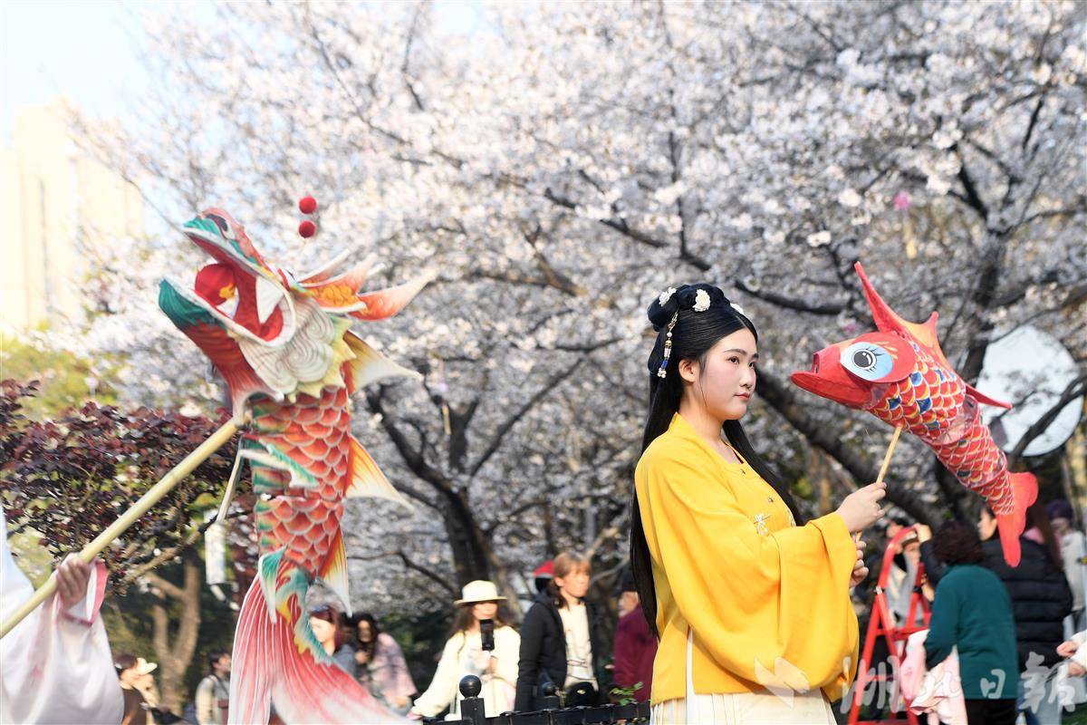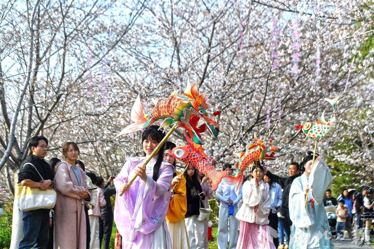 3月21日,武汉堤角公园中樱进入盛花期。身着汉服的角色扮演者手持非遗传承人亲手扎制的非遗鱼灯,尽显非遗与春日的浪漫碰撞。