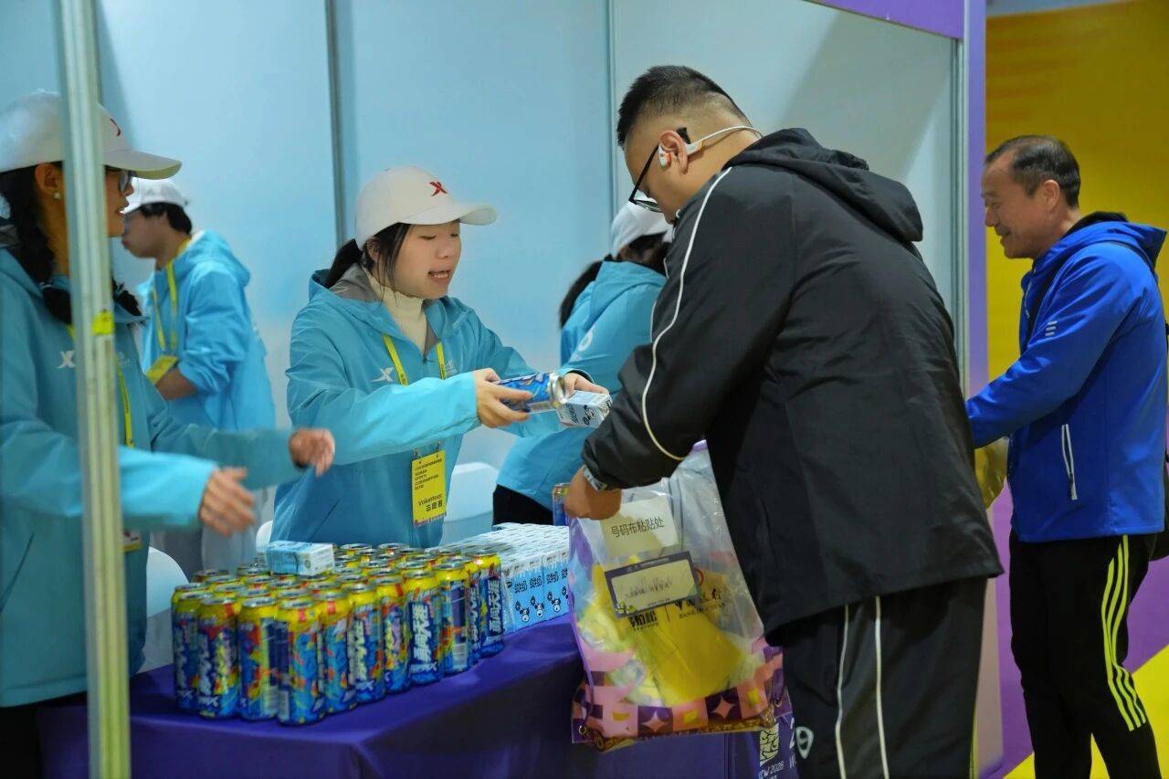 汉马赛道5km补给站,武汉文理学院志愿者向跑马运动员提供功能性饮料。