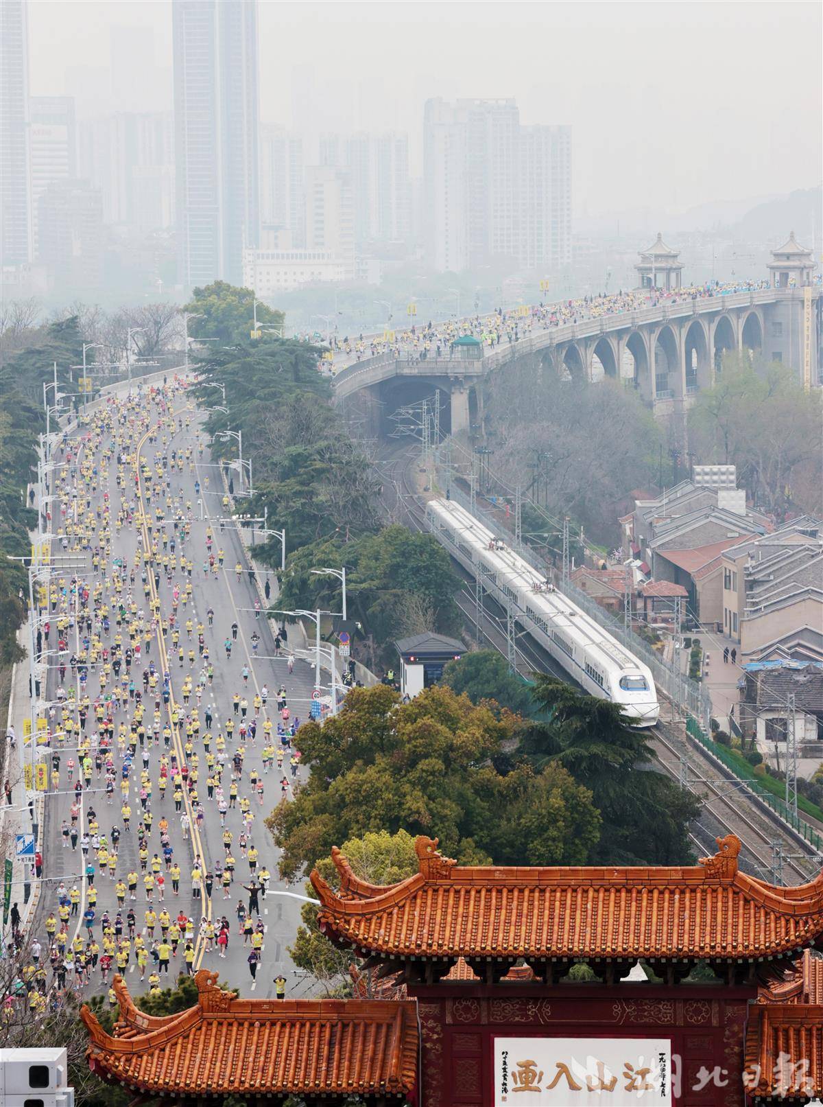 3 月 22 日,2026 武汉马拉松鸣枪开跑。上午 9 时07 分,武汉长江大桥上,一列高铁与参赛选手并肩前行,成为本届汉马最硬核 “陪跑”。速度与激情在 “万里长江第一桥” 同框定格,尽显英雄城市的蓬勃活力。(湖北日报全媒记者 陈迹 摄)