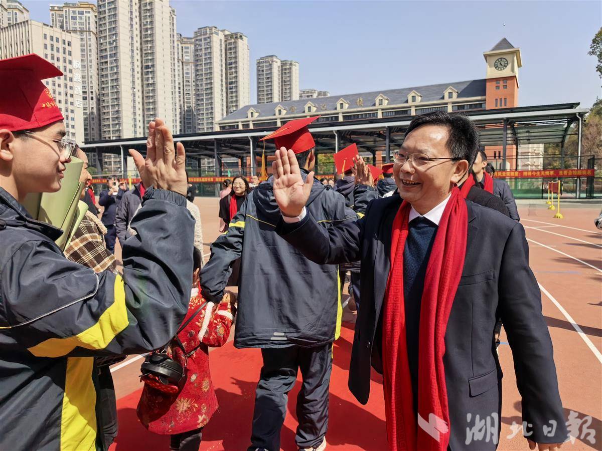 十堰市郧阳中学举行2026届高三成人礼,学校老师给学生击掌鼓劲。(湖北日报通讯员金勤 摄)
